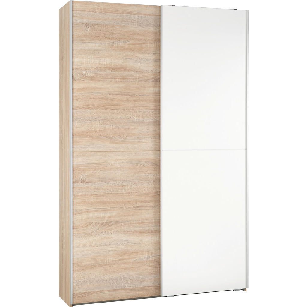 Dvoje posuvné dveře v kombinaci bílé barvy a dekoru dubu sonoma vytvářejí krásný kontrast, který dodává skříni na atraktivitě. Tento stylový design se hodí do různých interiérů – od ložnic přes dětské pokoje až po předsíně.