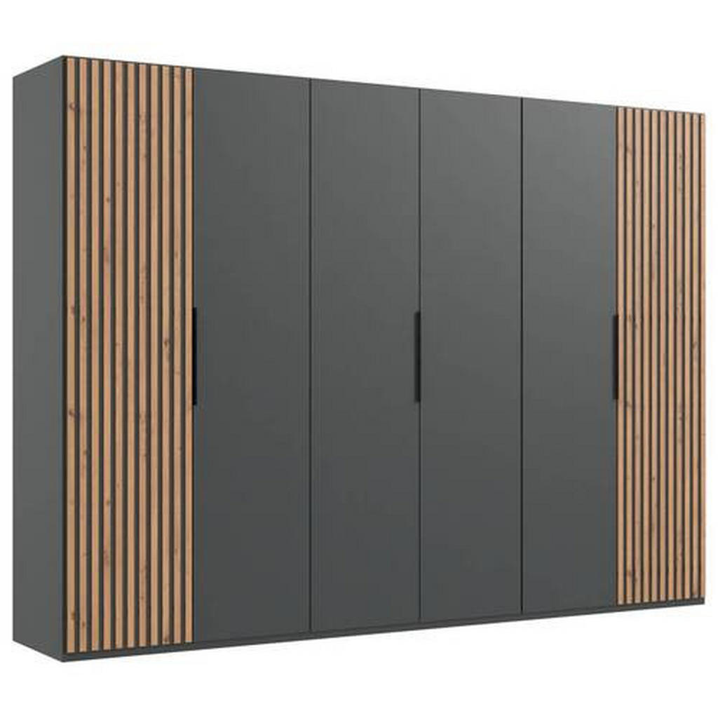 Šatní skříň s otočnými dveřmi je ideálním řešením pro každou ložnici. Její moderní design v kombinaci s grafitovou a dubovou barvou dodává interiéru elegantní vzhled. Rozměry skříně činí 300 cm na šířku, 216 cm na výšku a 58 cm na hloubku, což z ní činí prostorný a praktický kus nábytku.