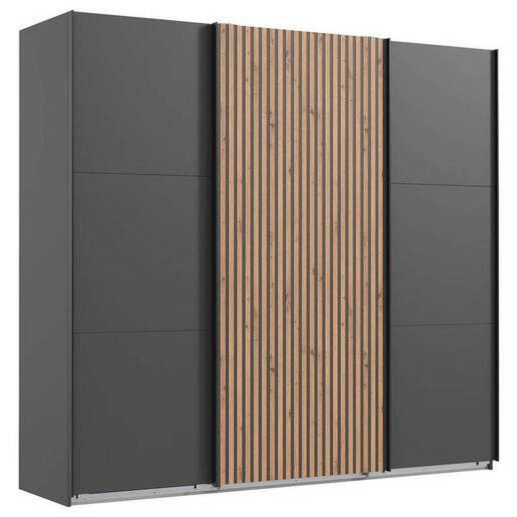 Získejte stylovou skříň s posuvnými dveřmi, která ušetří místo a nabídne dostatek úložného prostoru. Moderní design v barvách grafitu a dubu se hodí do každého interiéru.