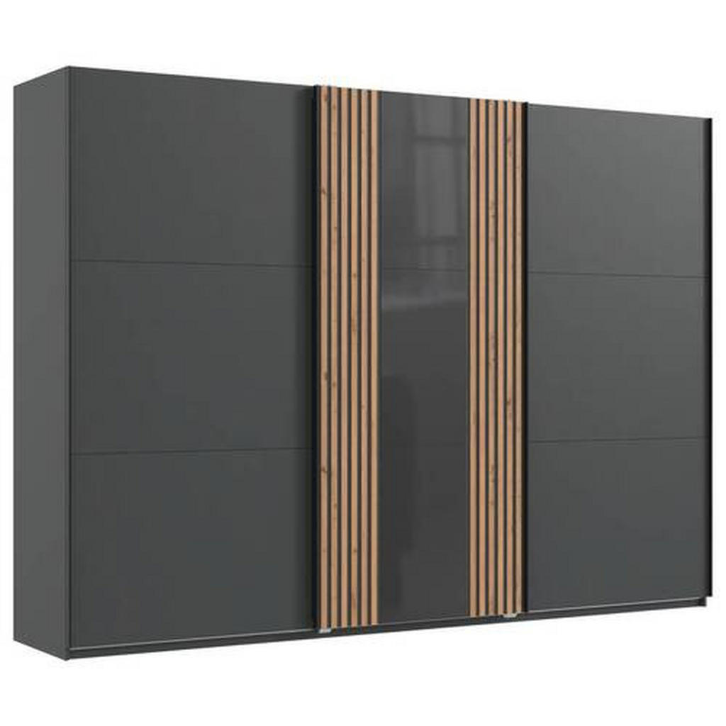Skříň MID.YOU kombinuje moderní prvky s praktickým využitím. Barvy grafitu a dub artisan vytvářejí harmonický kontrast, který se hodí do různých stylů interiéru. Posuvné dveře šetří prostor a umožňují snadný přístup k uloženým věcem.