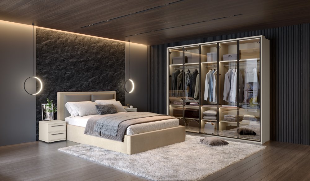 Jednou z předností této přídavné skříně je integrované vnitřní osvětlení s výkonem 8W, které je rozloženo do polic a stropu skříně. Každá police má osvětlení s výkonem 2W, což zajišťuje dostatek světla pro snadné hledání oblečení a doplňků. Interiér korpusu je navíc v textilním dekoru, který dodává příjemný pocit a estetičnost.