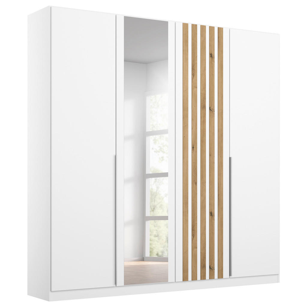 Skříň je navržena tak, aby kombinovala moderní design s maximální funkčností. Bílé provedení skříně je doplněno o dekoraci dubu artisan, což jí dodává přírodní a teplý vzhled. Otočné dveře poskytují snadný přístup k obsahu skříně a zrcadlová dvířka opticky zvětšují prostor.
