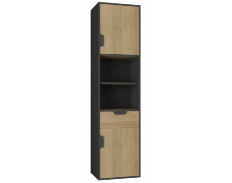 Vzhled regálu/skříňky je navržen s ohledem na moderní trendy. Kombinace přírodního dubového dekoru s grafitovými prvky vytváří harmonický kontrast, který zaujme na první pohled. Tento design se hodí jak do obývacího pokoje, tak do pracovny či dětského pokoje.