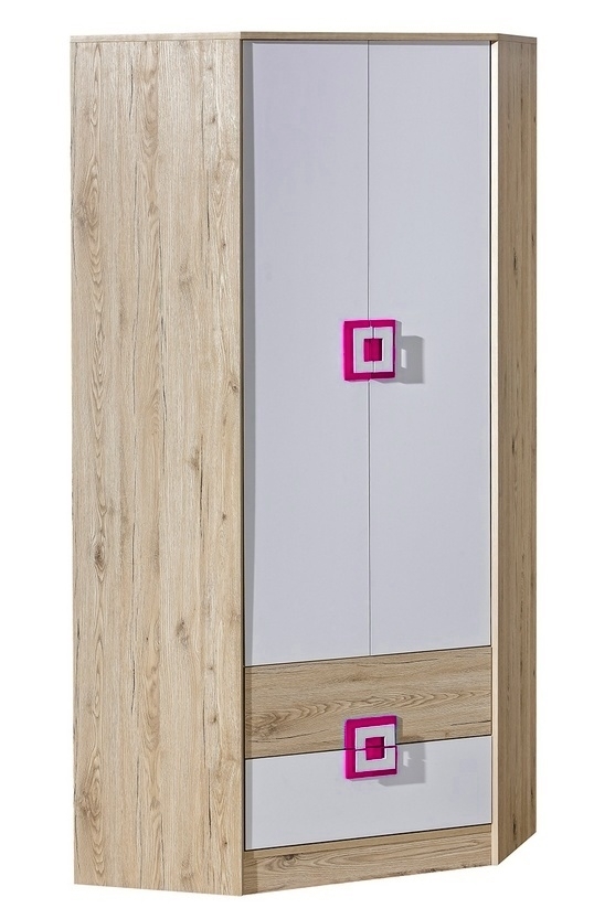 - Barva: Korpus v barvě dub jasný, dveře v kombinaci bílé matné a dub jasný, úchytky v růžové a bílé.
