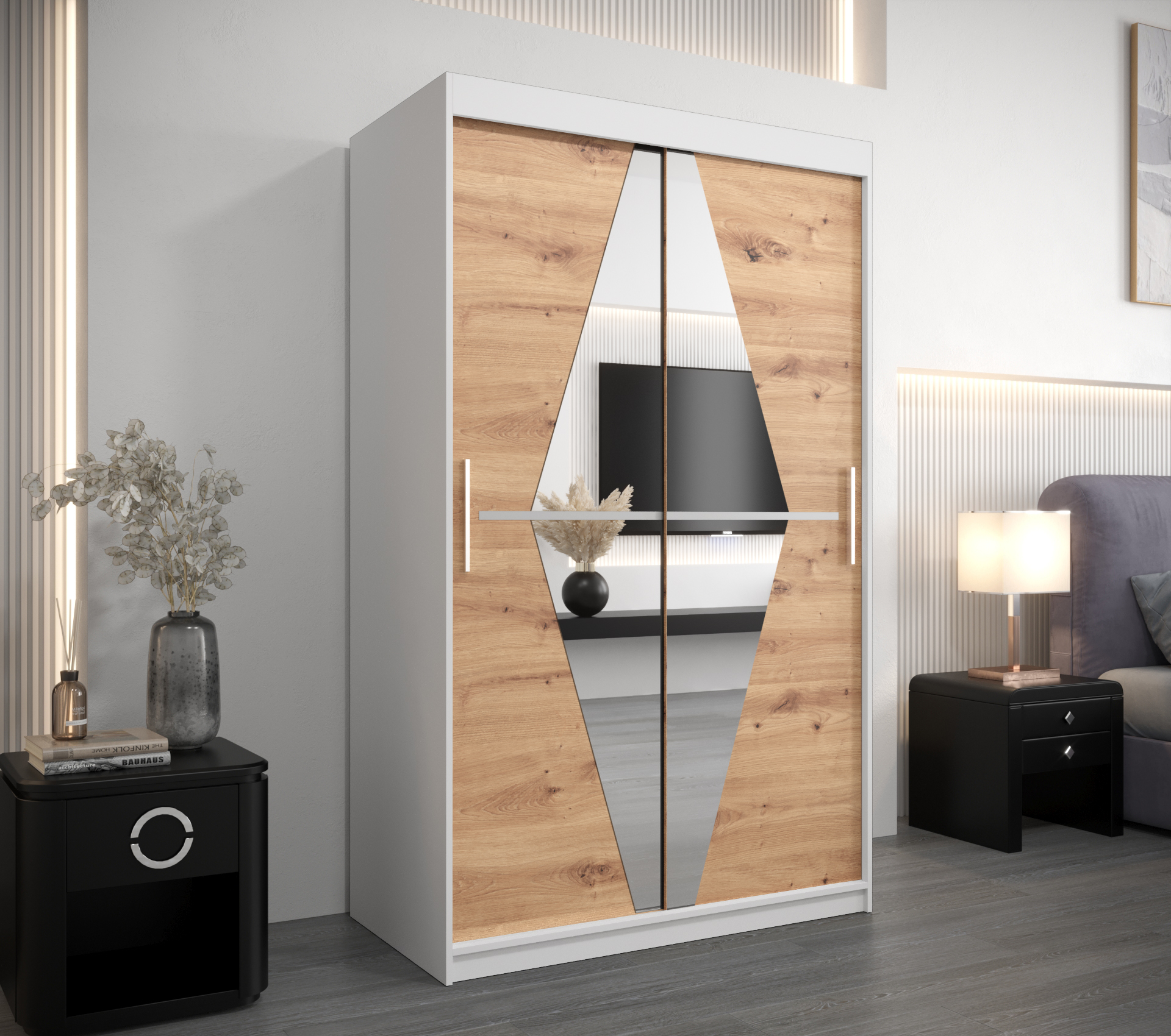 - Zrcadlo: Skříň je vybavena zrcadlem, které opticky zvětšuje prostor a je praktickým pomocníkem při oblékání.