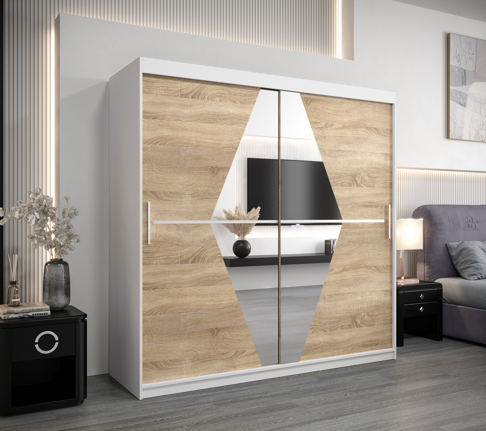 Šatní skříň Abi Bo spojuje moderní design s praktickým úložným prostorem. Ideální volba pro každou ložnici, s možností přizpůsobení a rozšíření.