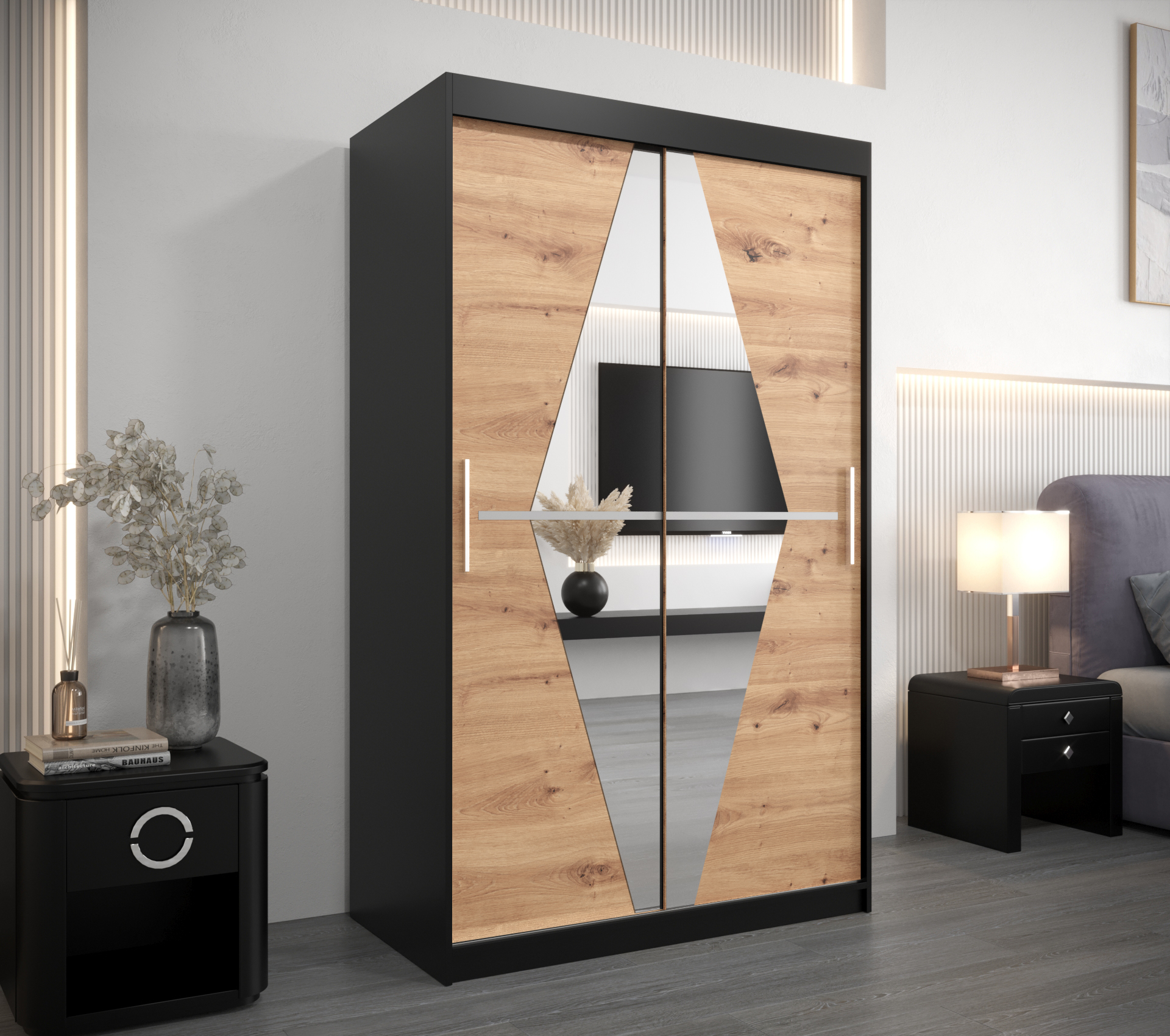 Hledáte stylovou a prostornou šatní skříň? Šatní skříň Abi Bo je ideálním řešením pro každou moderní ložnici. S elegantním černým korpusem a dveřmi v dekoru dub artisan přináší nejen funkčnost, ale také atraktivní design.