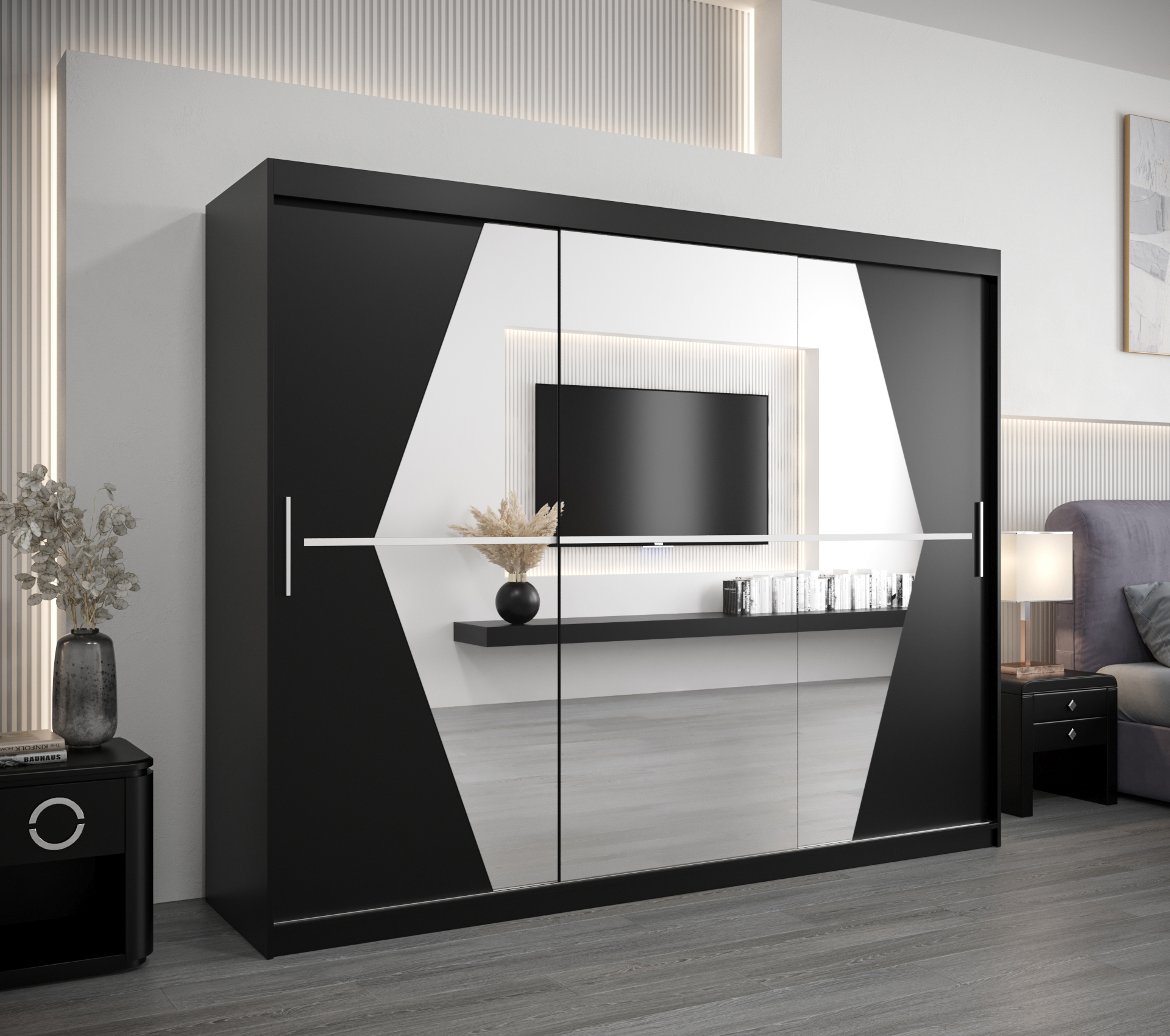 Šatní skříň Abi Bo je ideálním řešením pro každou moderní ložnici. S rozměry 250 cm a elegantním černým korpusem nabízí dostatek úložného prostoru pro vaše oblečení a doplňky. Její posuvné dveře šetří místo a dodávají skříni nadčasový vzhled, který se hodí do jakéhokoliv interiéru.