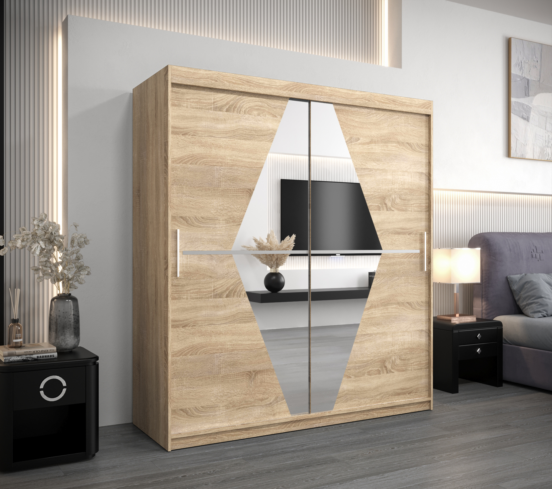- Zrcadlo: Skříň je vybavena zrcadlem, které opticky zvětšuje prostor a usnadňuje ranní přípravy.