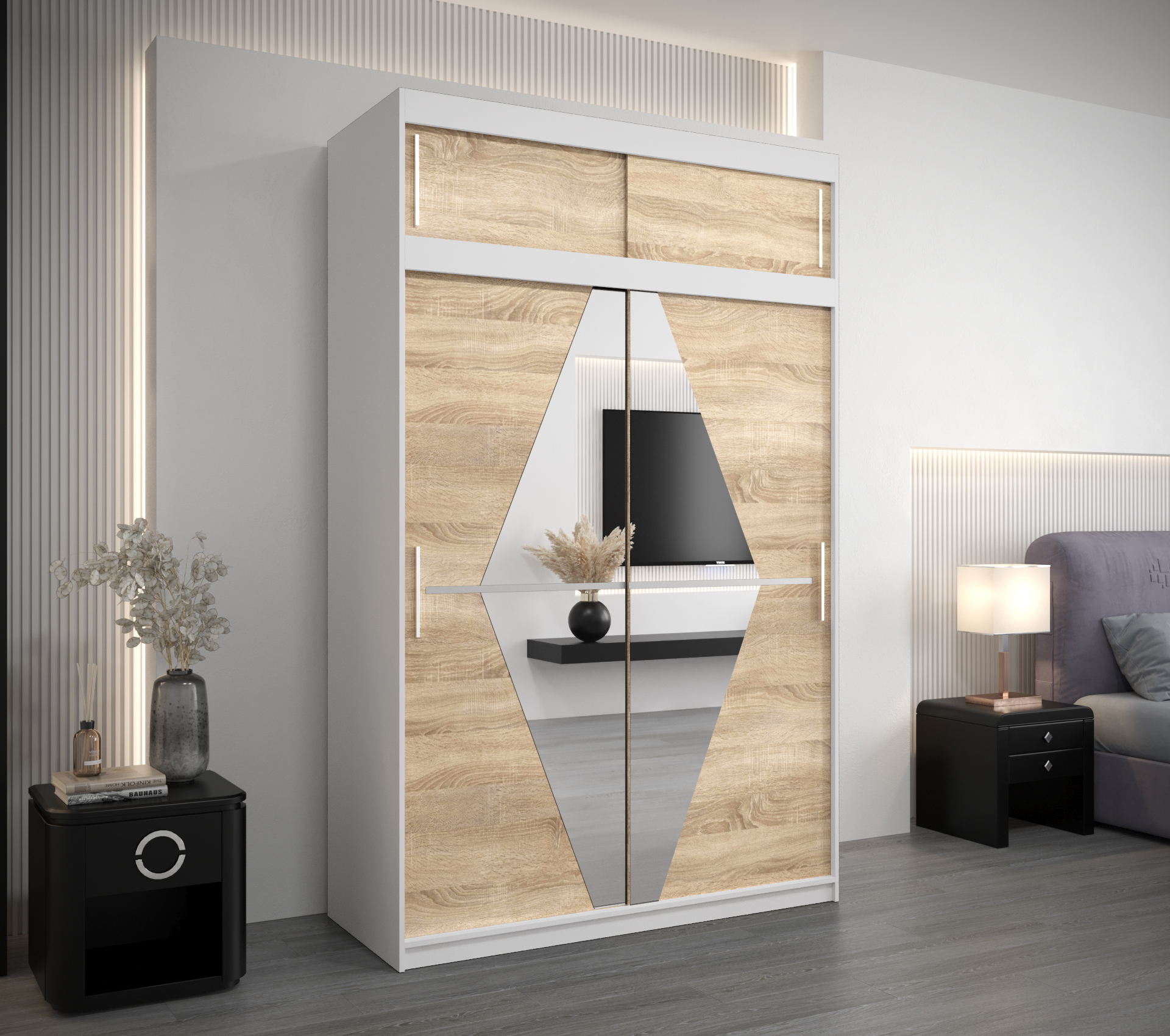 - Zrcadlo: Součástí skříně je také zrcadlo, které opticky zvětšuje prostor.