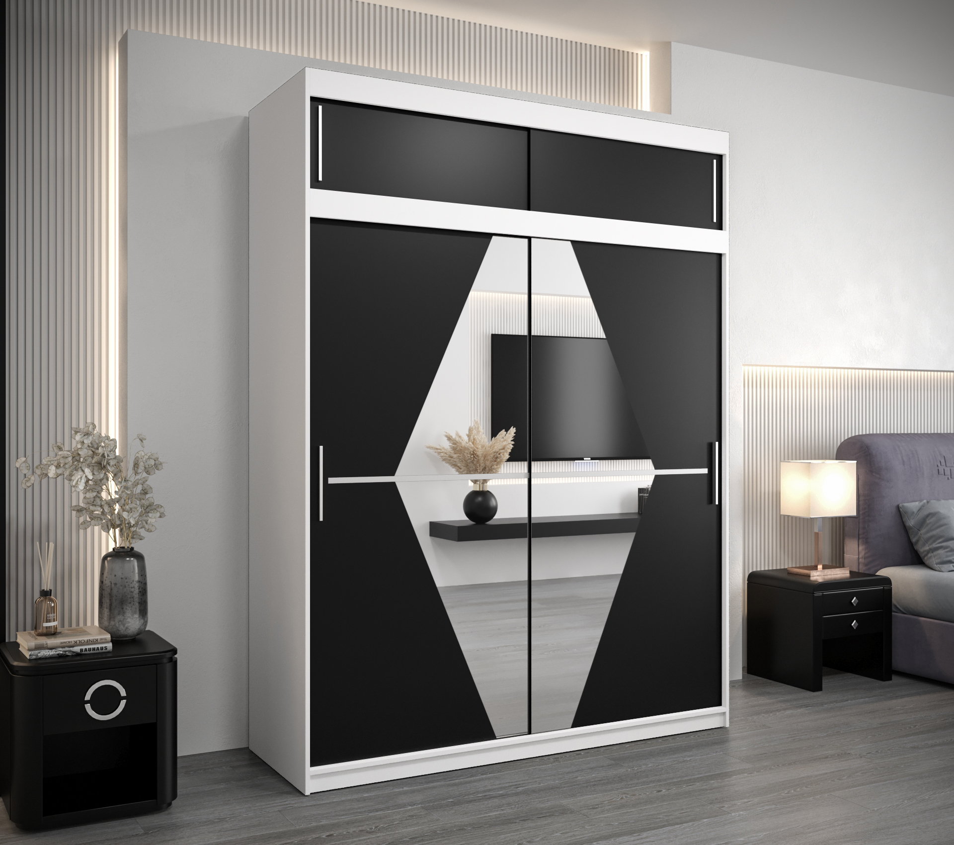 Šatní skříň Abi Bo s nástavcem je ideální volbou pro každého, kdo hledá kombinaci moderního designu a praktického úložného prostoru. Tato skříň v bílém provedení s černými posuvnými dveřmi nabízí nejen stylový vzhled, ale také dostatek místa pro vaše oblečení a další věci.