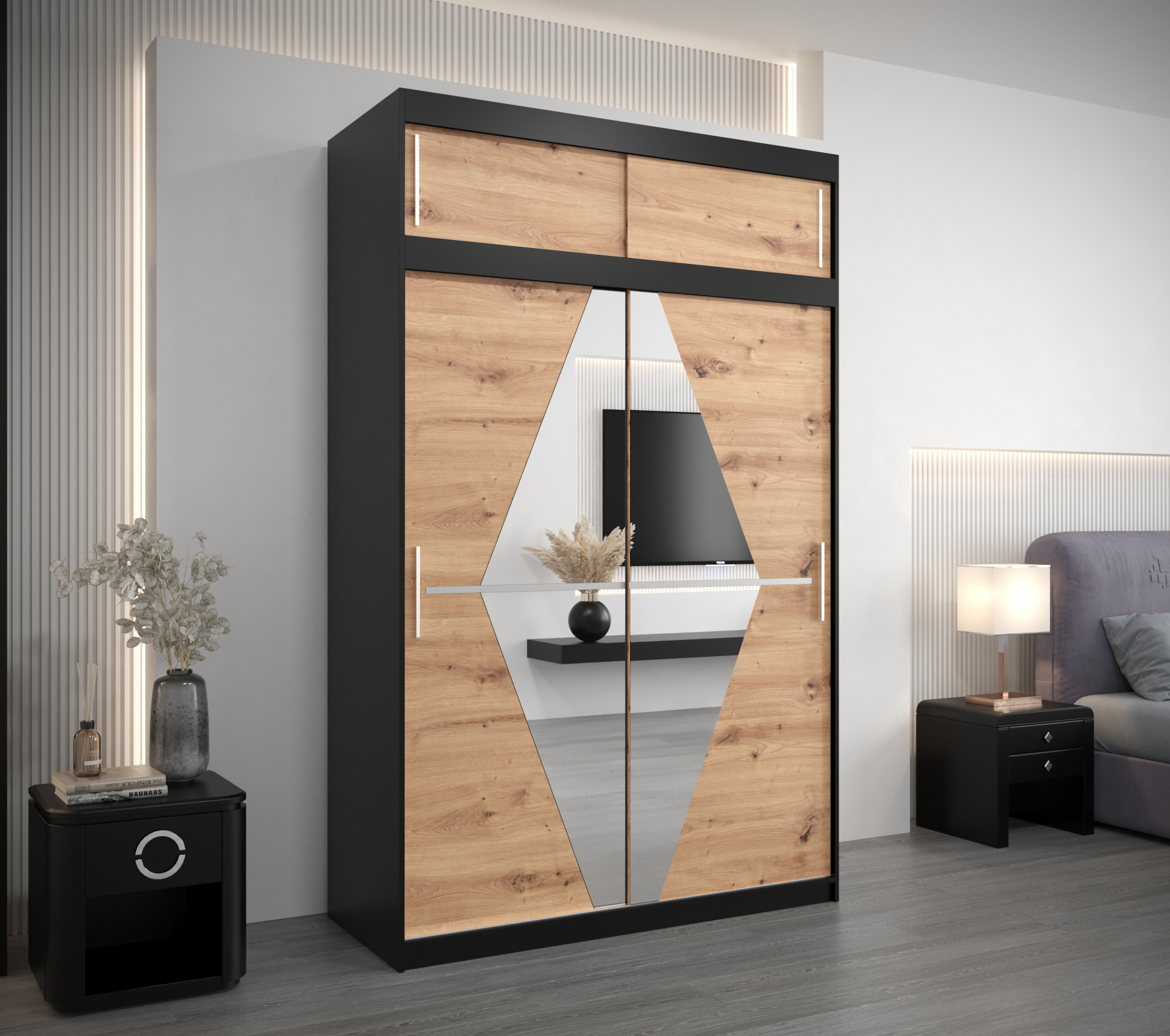 Vnitřní uspořádání šatní skříně nabízí dvě šatní tyče a police, které poskytují dostatek prostoru pro vaše oblečení. Pro ještě větší pohodlí si můžete dokoupit zásuvky, které skříň prakticky rozšíří.