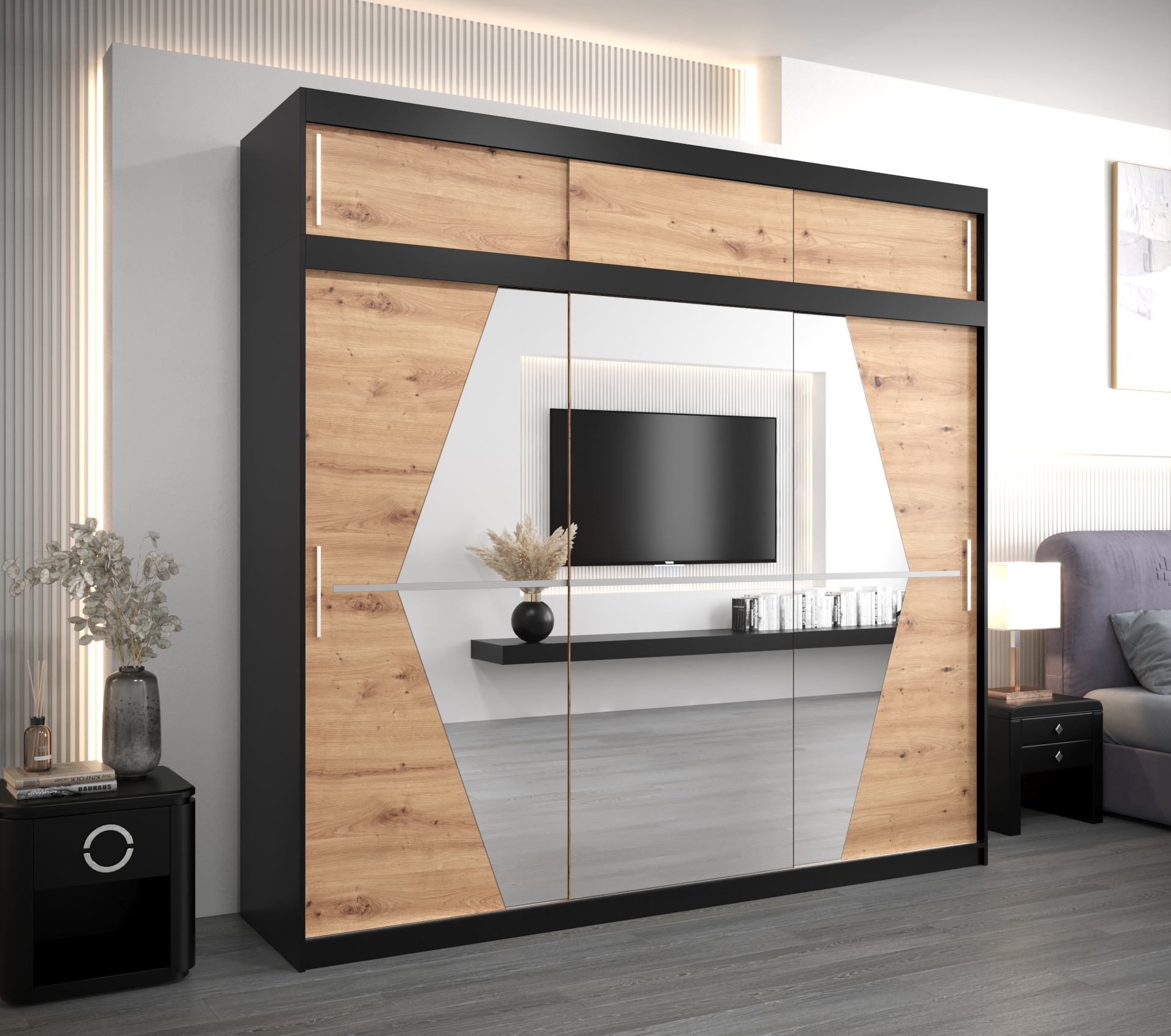 Celková výška skříně je 240 cm a šířka 250 cm, což z ní činí ideální volbu pro prostorné ložnice. Skříň je také dostupná v různých šířkách – od 100 cm až po 250 cm.