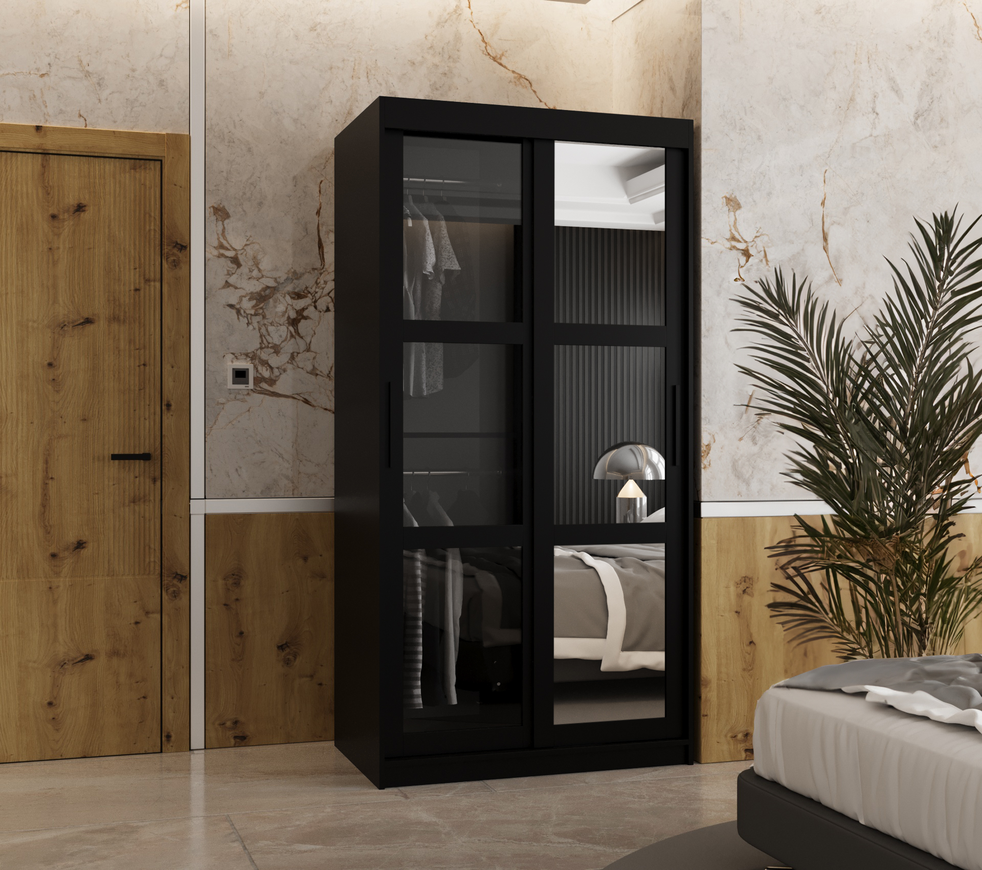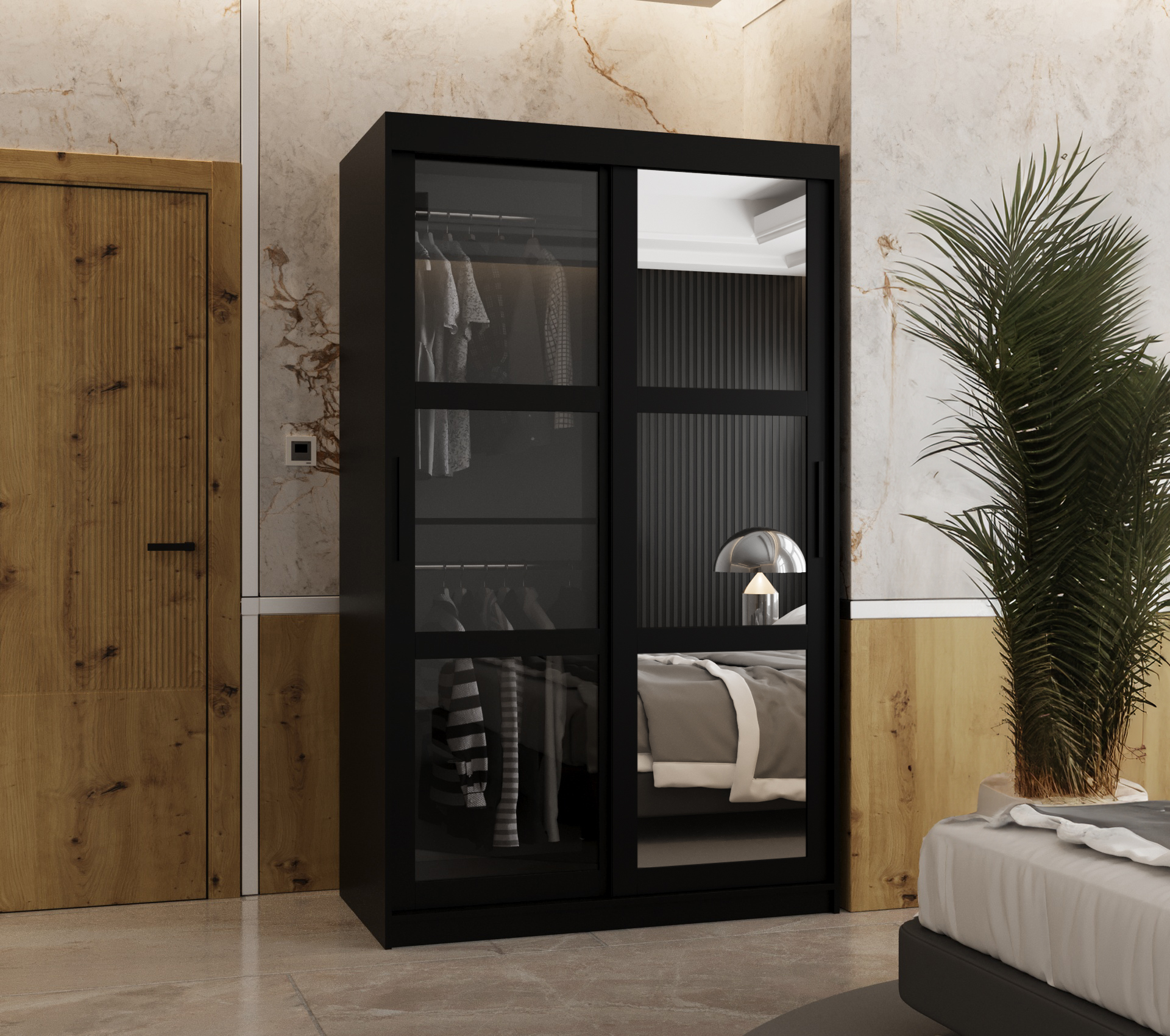 - Stylové detaily: Posuvné dveře jsou vybaveny kouřovým sklem a leštěným zrcadlem, což dodává skříni moderní vzhled.