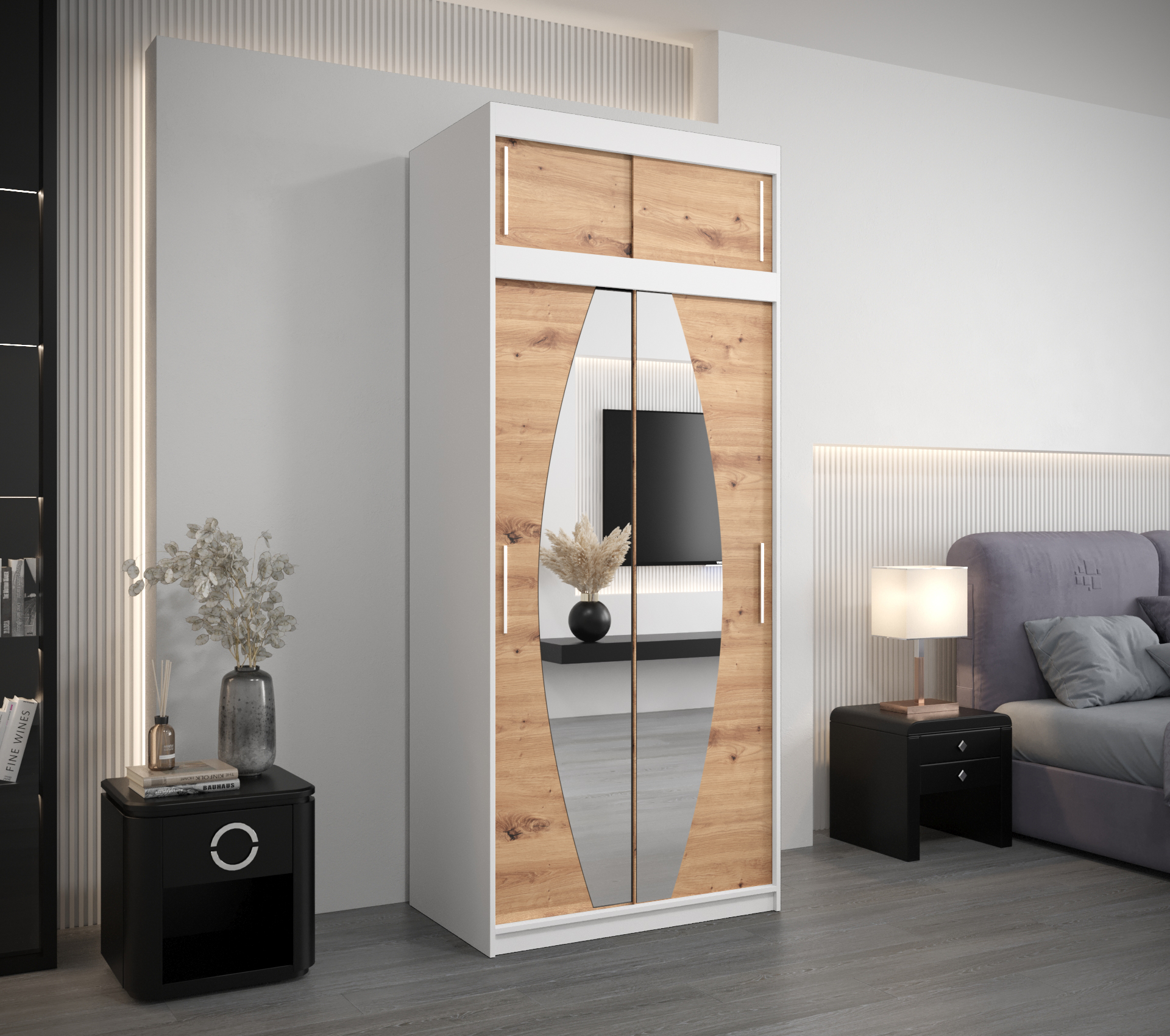 Šatní skříň Abi E0 je dostupná v několika barevných dekorech, včetně dub artisan, dub sonoma, černé a bílé. Díky široké škále barev si můžete snadno přizpůsobit skříň svému interiéru.