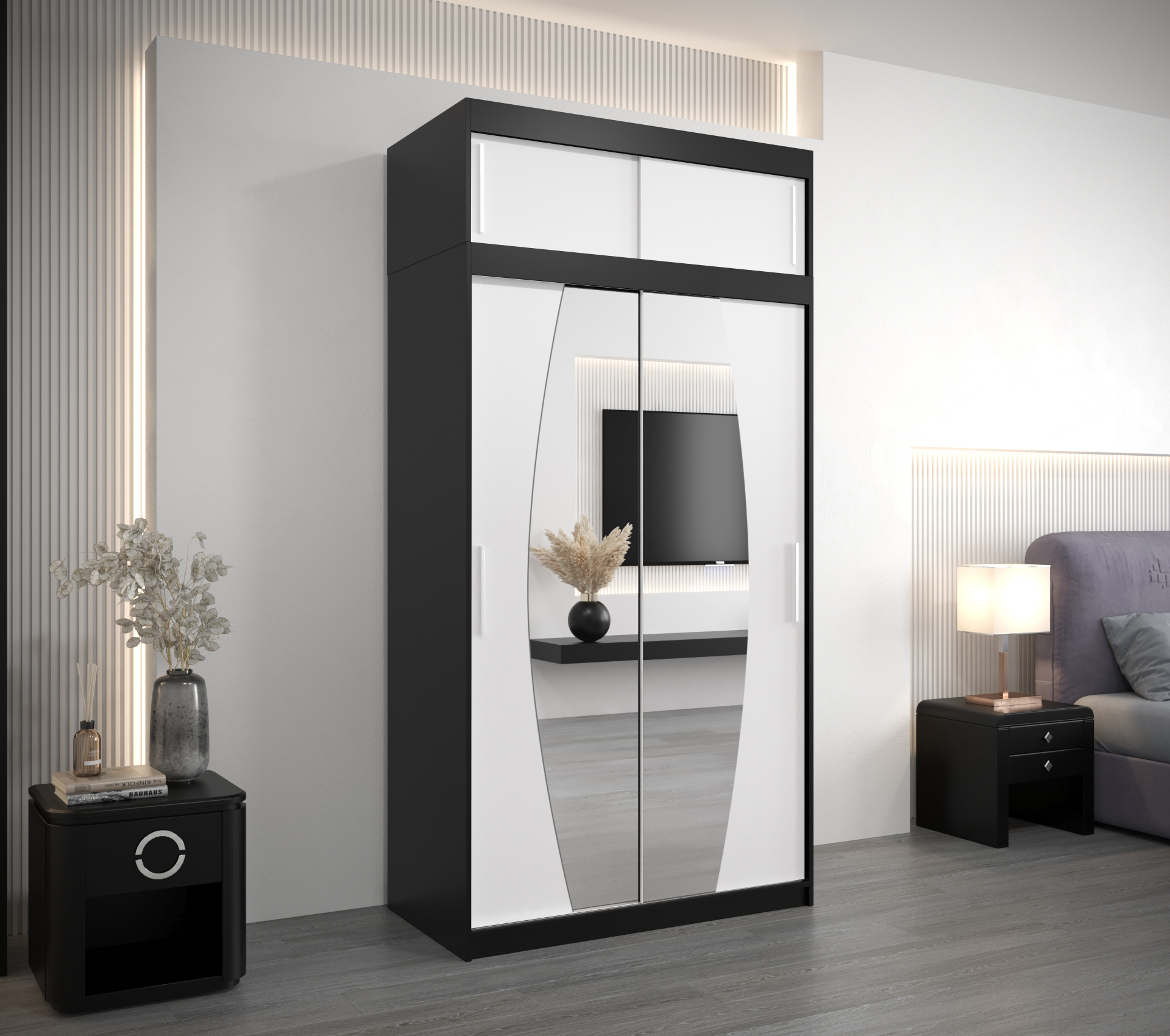 - Vnitřní uspořádání: Dvě šatní tyče a police, s možností dokoupit zásuvky pro další úložný prostor.