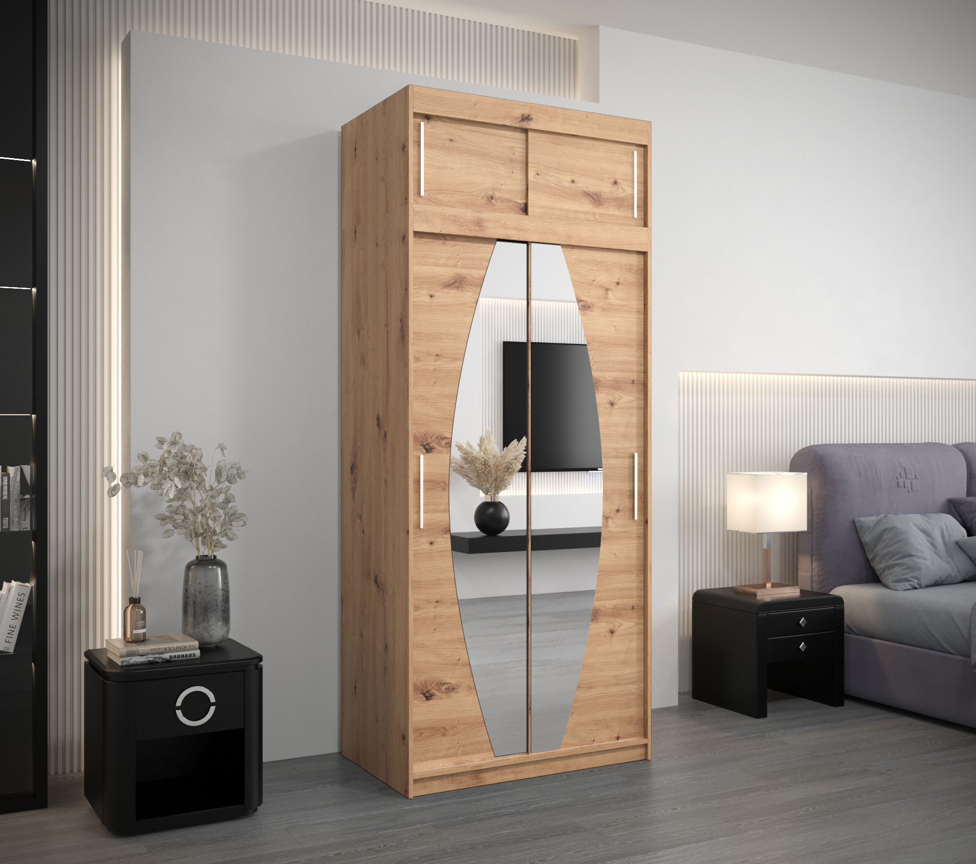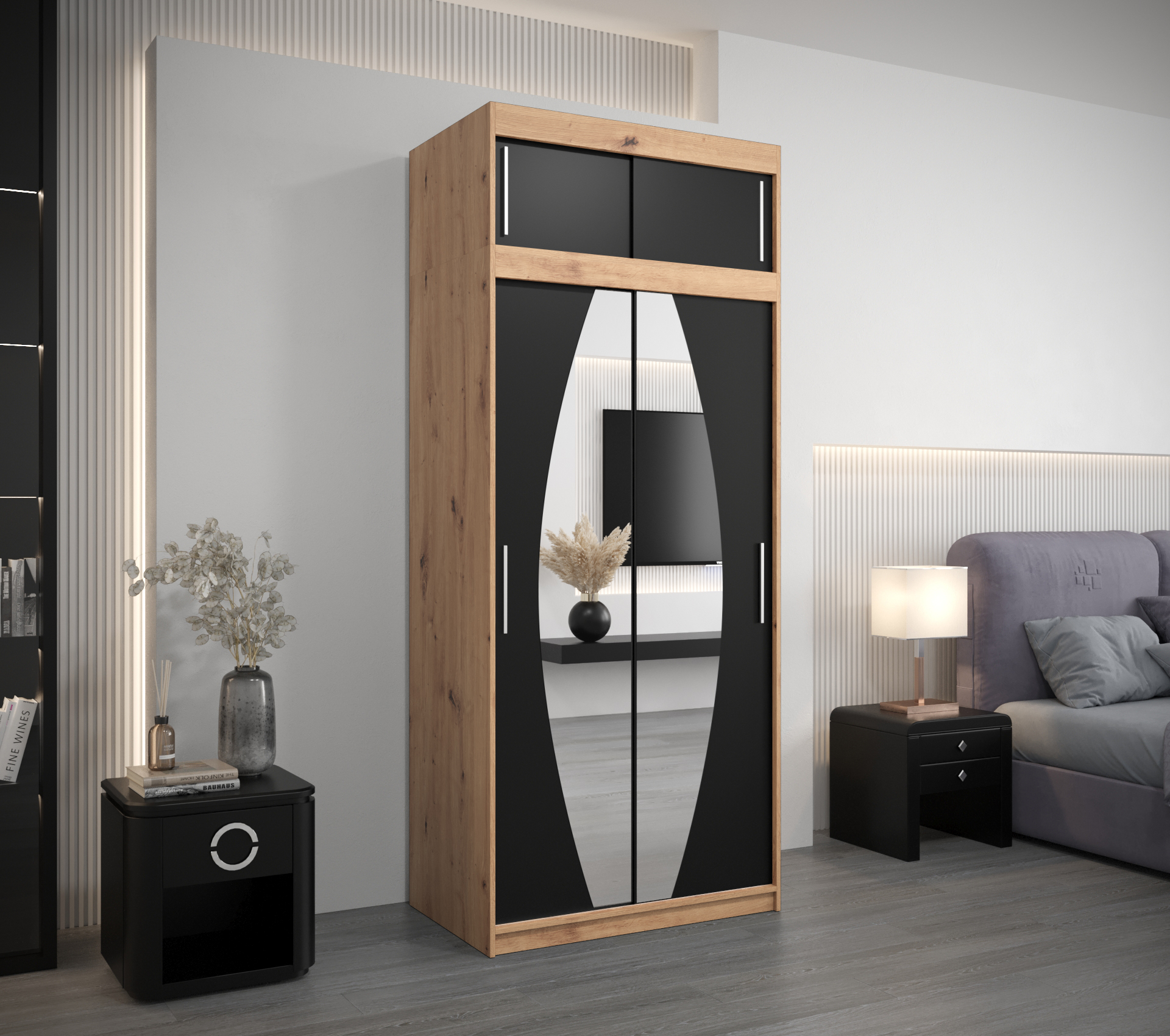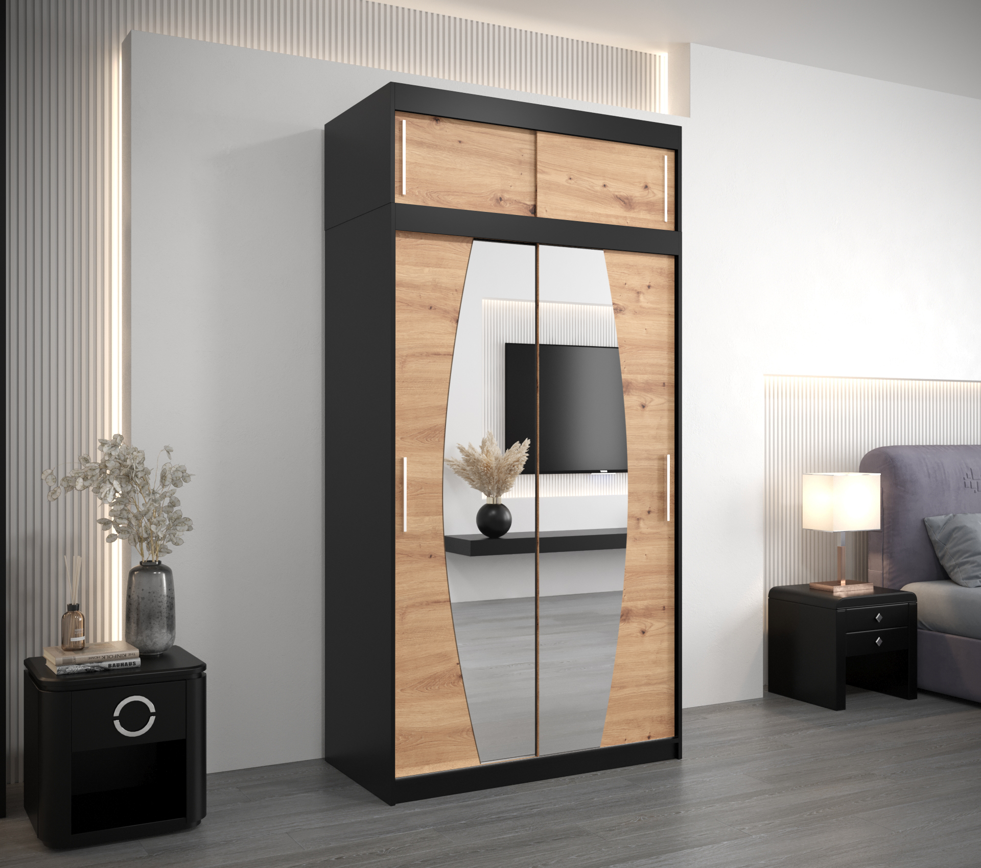 Šatní skříň Abi E0 s nástavcem představuje ideální volbu pro každého, kdo hledá moderní a stylové řešení úložného prostoru. Její elegantní design v černé barvě s dveřmi v dekoru dub artisan dodává každé ložnici nádech sophistication. Díky posuvným dveřím šetříte místo a usnadňujete přístup k vašemu oblečení.