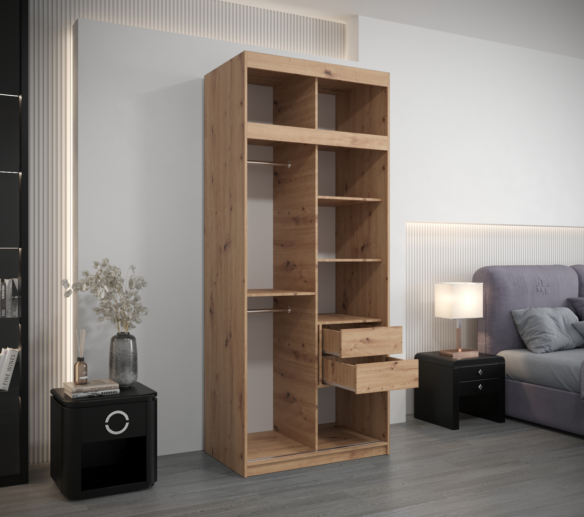 - Vnitřní uspořádání: Skříň obsahuje dvě šatní tyče a police, které lze doplnit o zásuvky pro větší variabilitu.