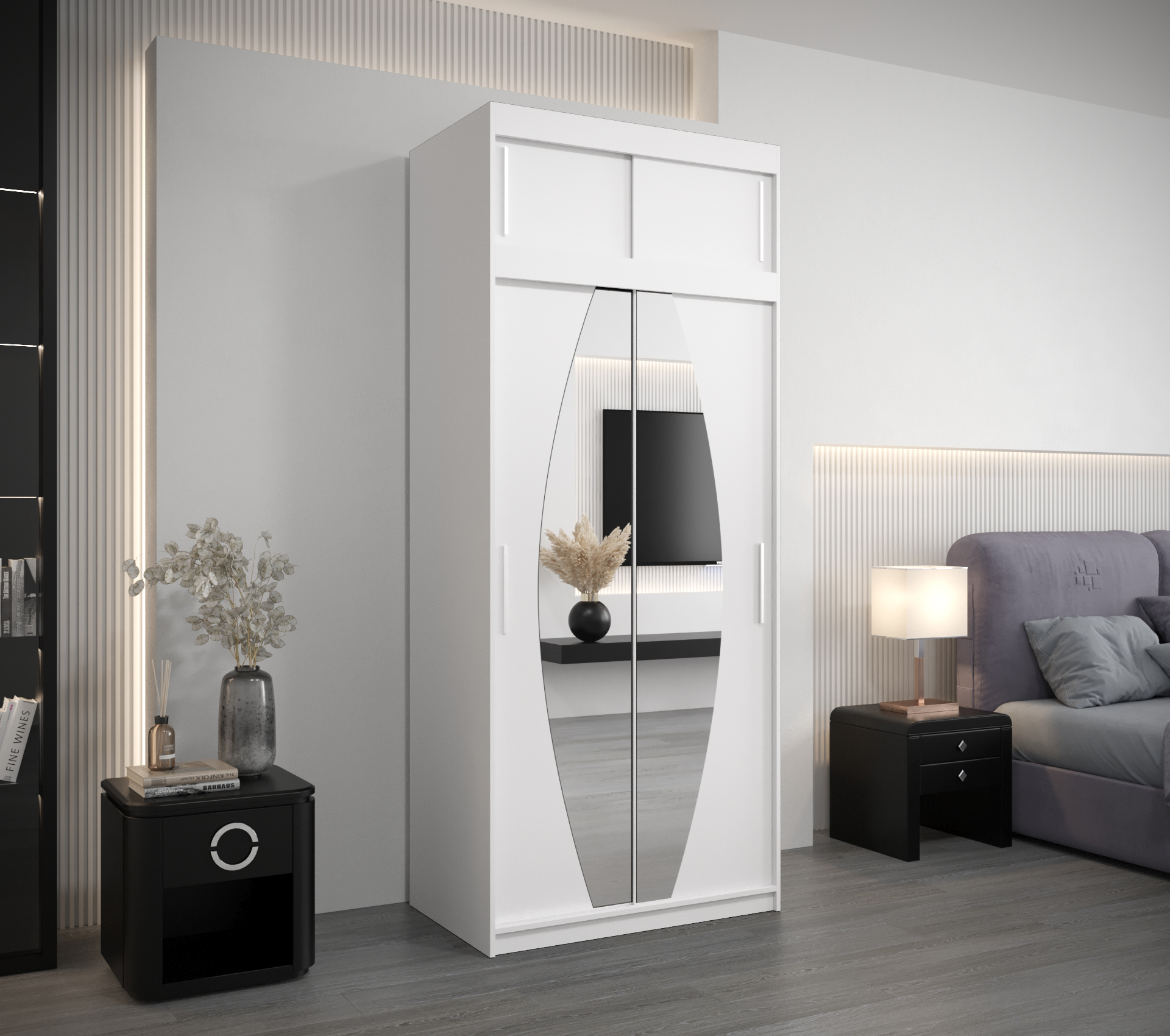 - Zrcadlo: Součástí skříně je zrcadlo, které opticky zvětší prostor a přidá na funkčnosti.