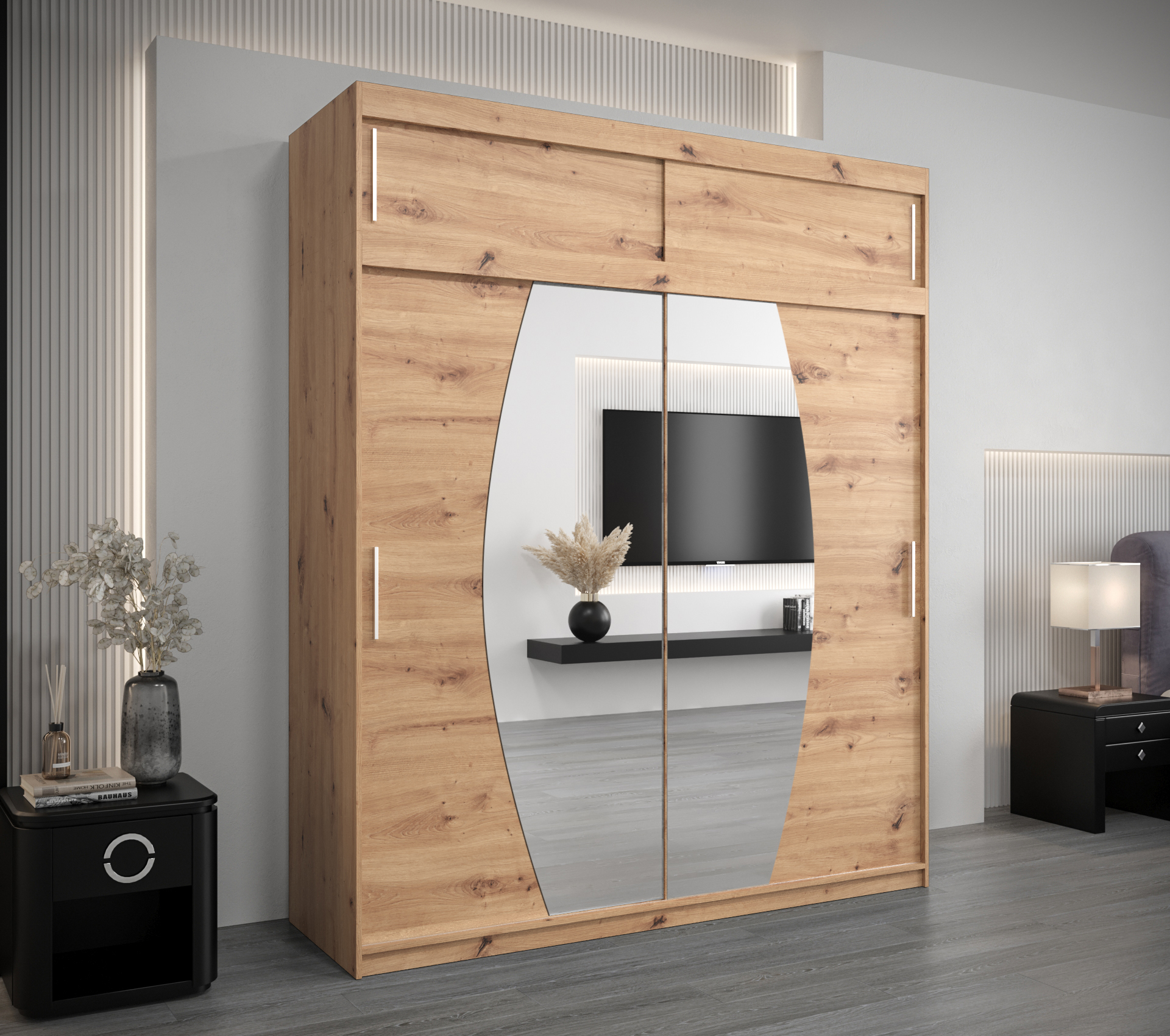 Šatní skříň Abi E0 s nástavcem je ideálním řešením pro každou moderní ložnici. Její elegantní design v dekoru dub artisan přináší do vašeho interiéru přírodní krásu a styl. Díky posuvným dveřím šetříte místo a usnadňujete přístup k obsahu skříně.