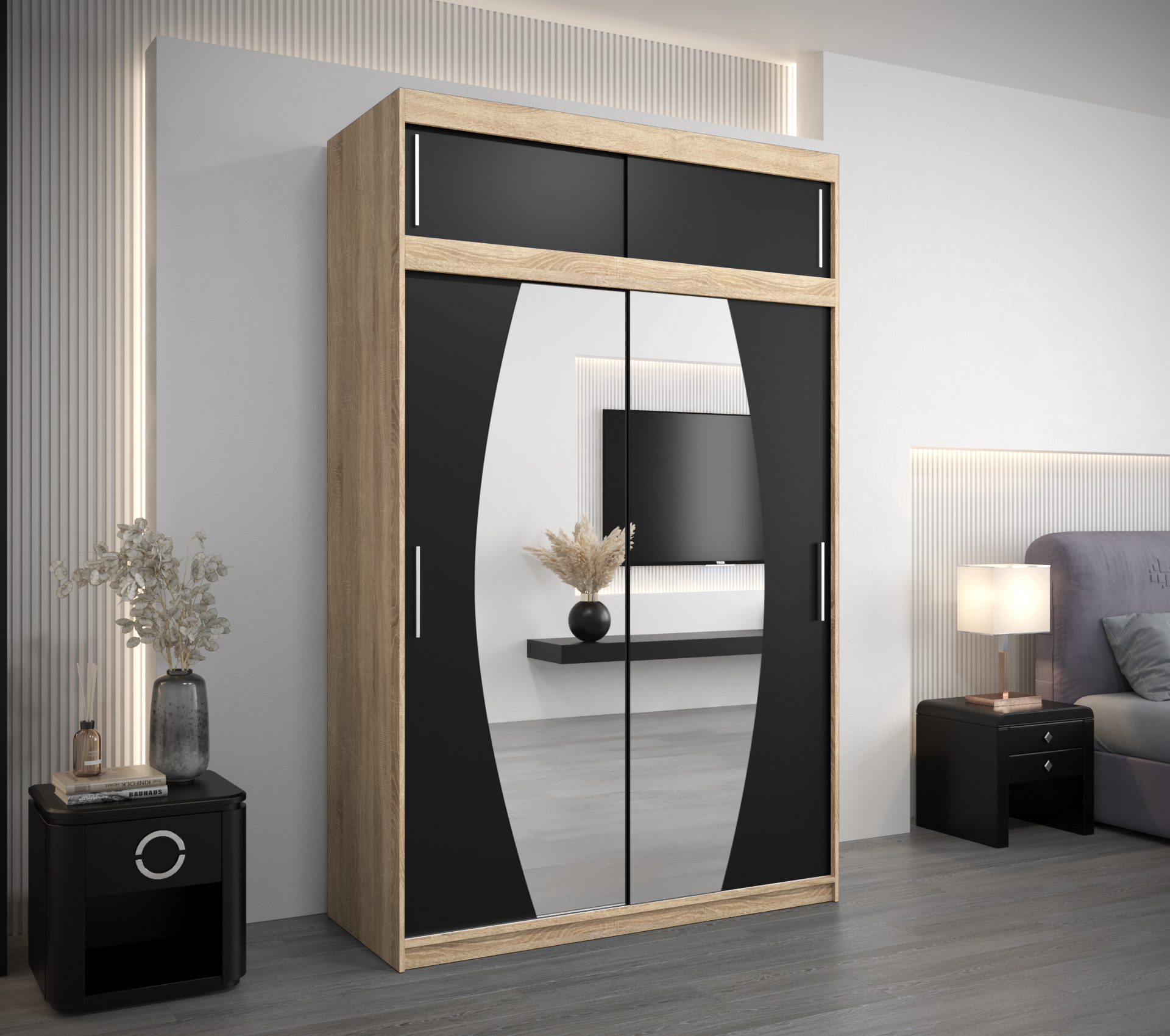 Šatní skříň Abi E0 s nástavcem je ideálním řešením pro moderní interiéry, kde se snoubí funkčnost s estetickým designem. Tato skříň, vyrobená z kvalitní laminované dřevotřískové desky, zaručuje dlouhou životnost a odolnost. Její korpus v dekoru dub sonoma a černé posuvné dveře přinášejí do vašeho domova styl a eleganci.