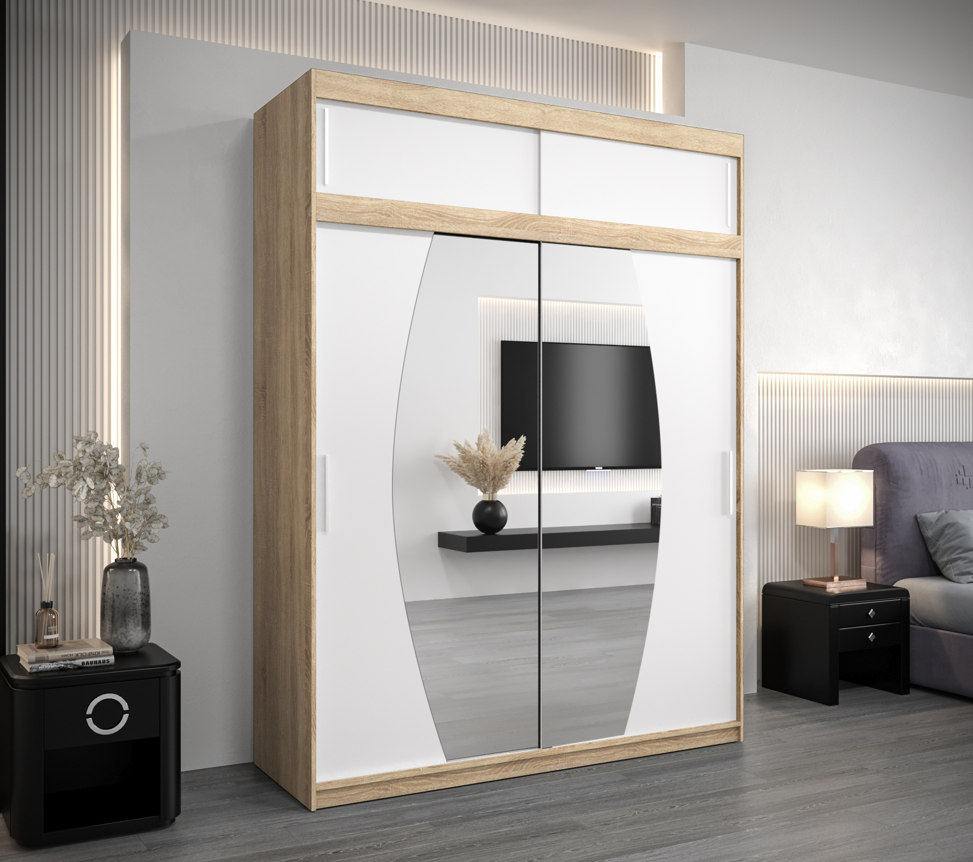 - Zrcadlo: Součástí skříně je zrcadlo, které opticky zvětšuje prostor a usnadňuje výběr oblečení.