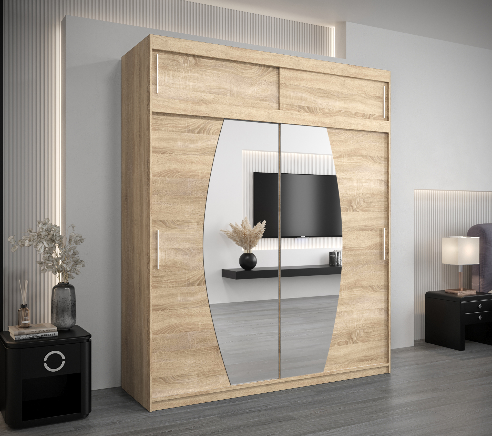 - Zrcadlo: Skříň je vybavena zrcadlem, které opticky zvětšuje prostor a je praktickým doplňkem.