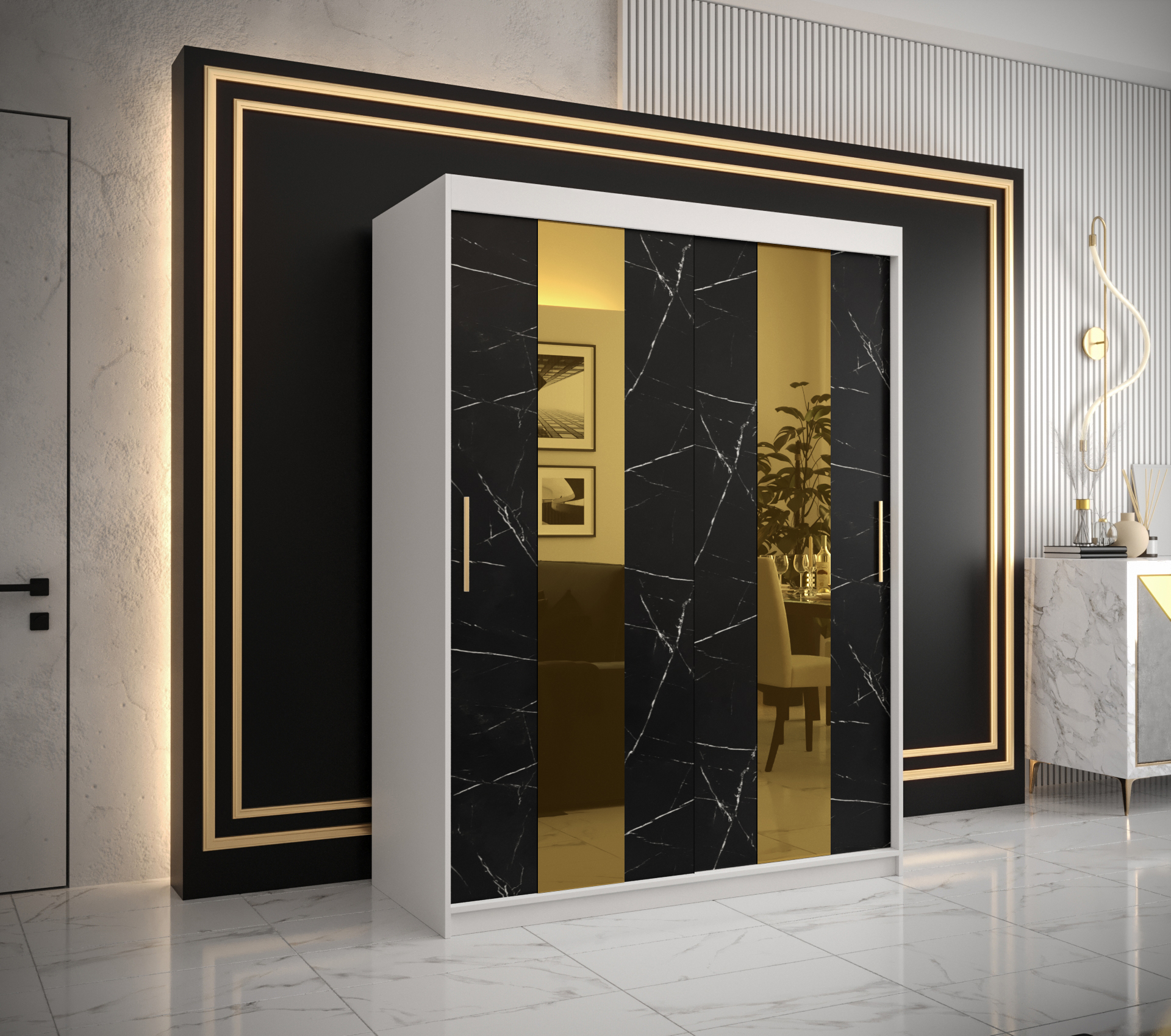 • Elegantní design: Dveře skříně jsou zdobeny černým mramorem a zlatým zrcadlem, které dodává skříni luxusní vzhled.