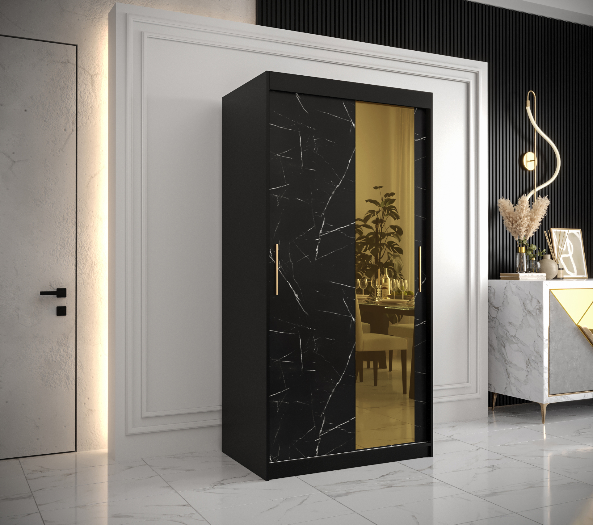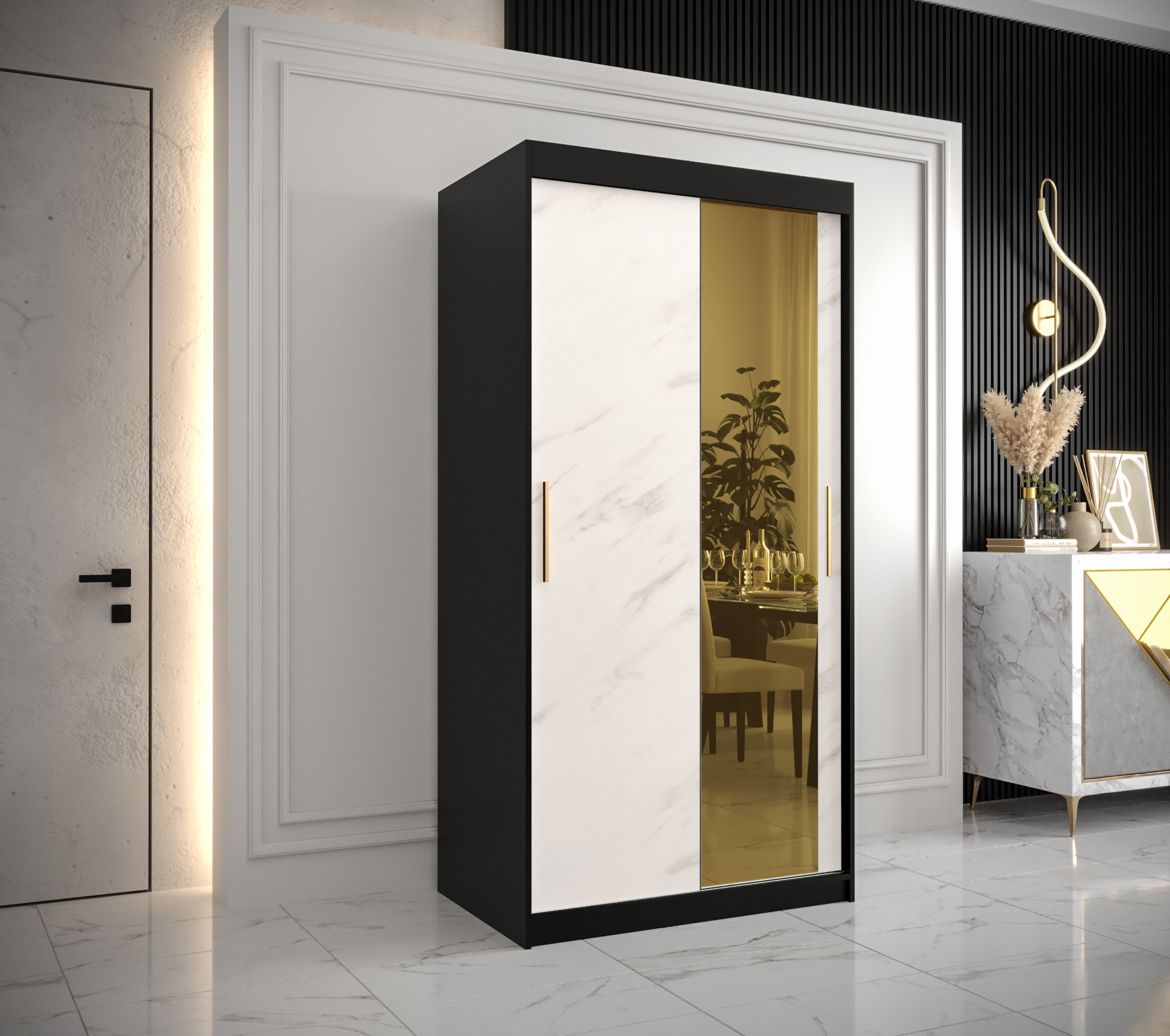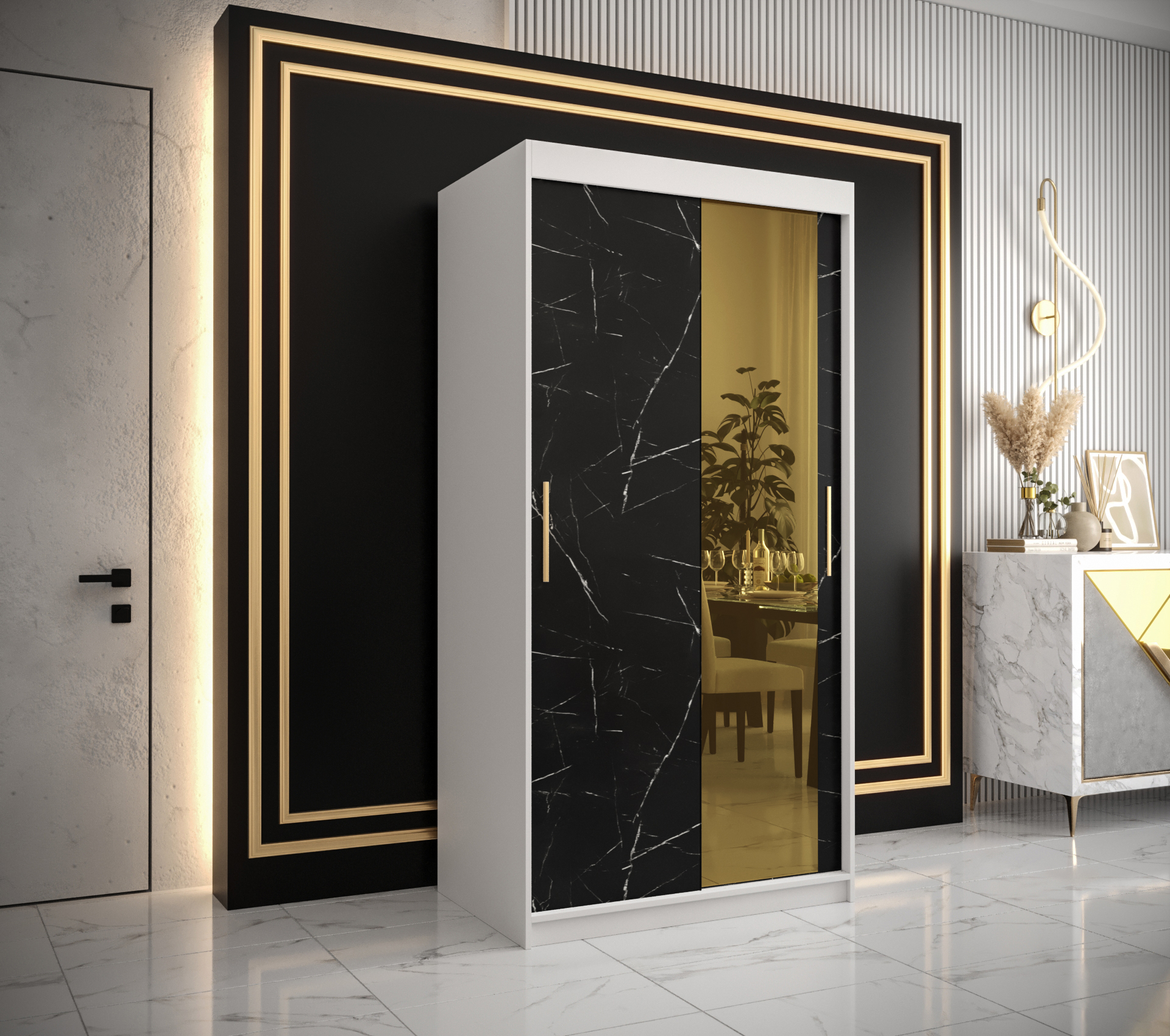 Šatní skříň Abi Golden T2 je k dispozici v bílé a černé variantě, přičemž každá z nich je doplněna o designové dveře s černým nebo bílým marmorem. Rozměry skříně jsou 120 cm na šířku, 200 cm na výšku a 62 cm na hloubku, což ji činí ideální volbou pro menší i větší místnosti.