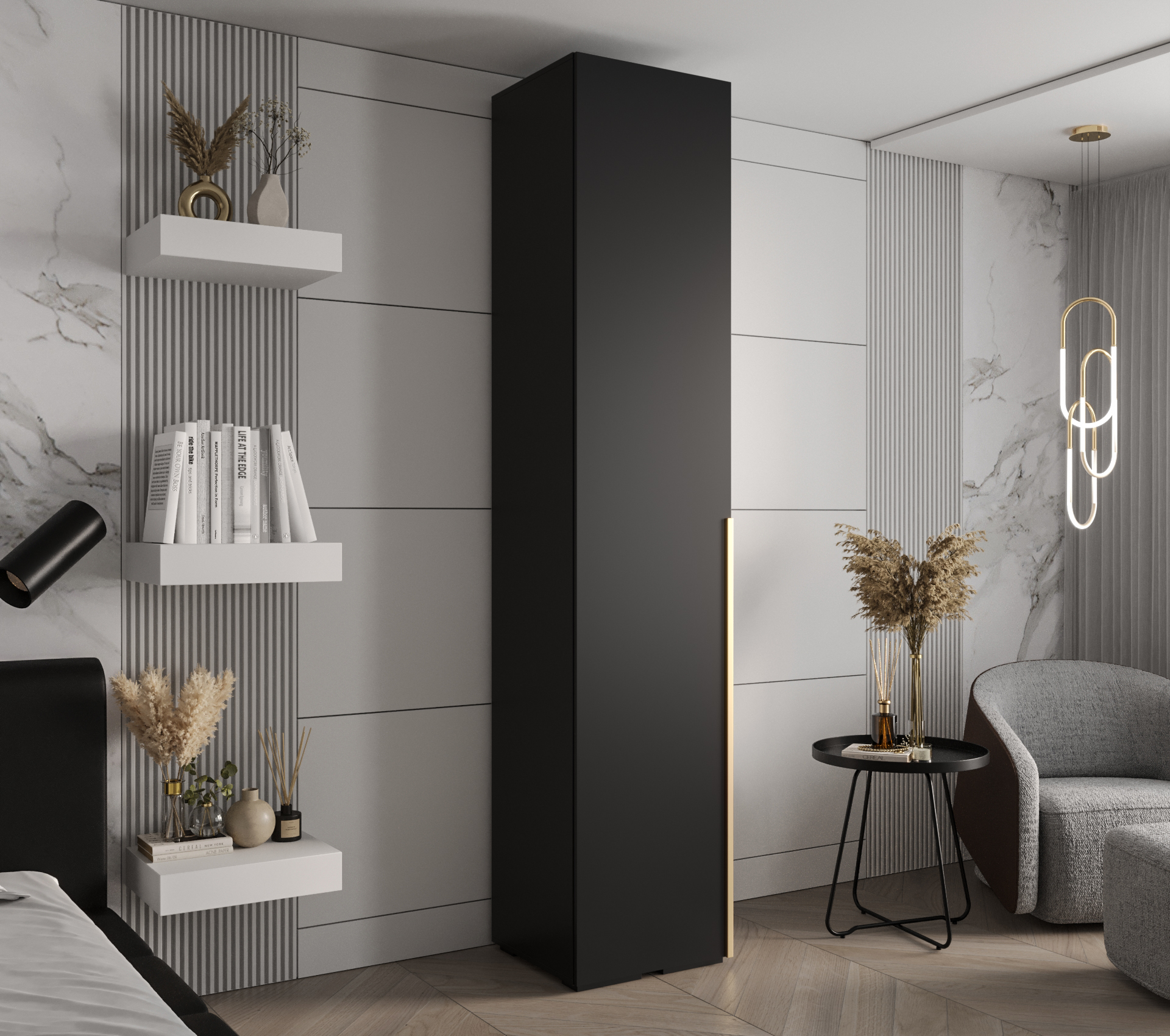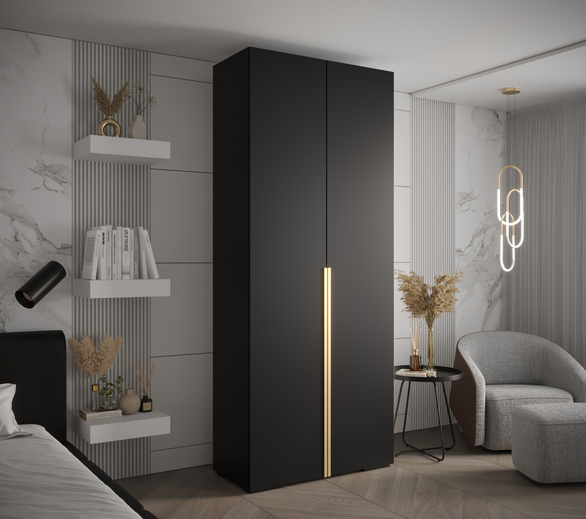 Šatní skříň Abi Inova je dostupná v bílé nebo černé barvě, přičemž každá varianta je doplněna o elegantní zlatý úchyt, který dodává skříni na atraktivitě.