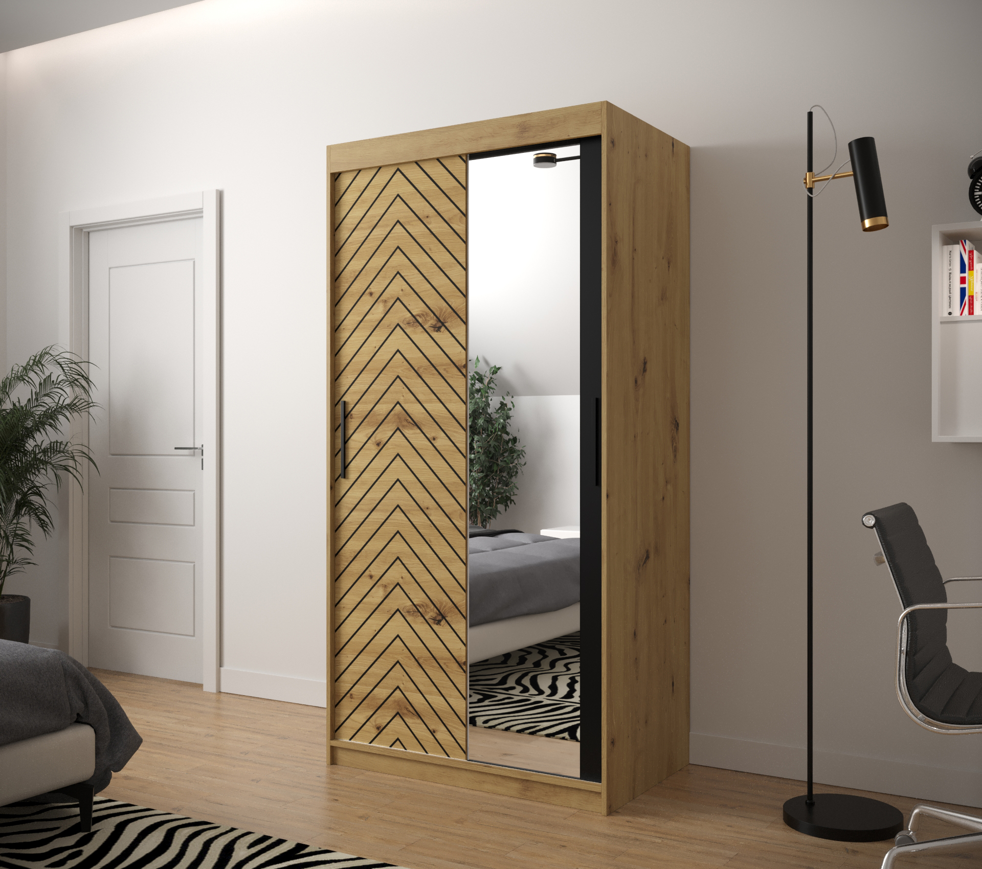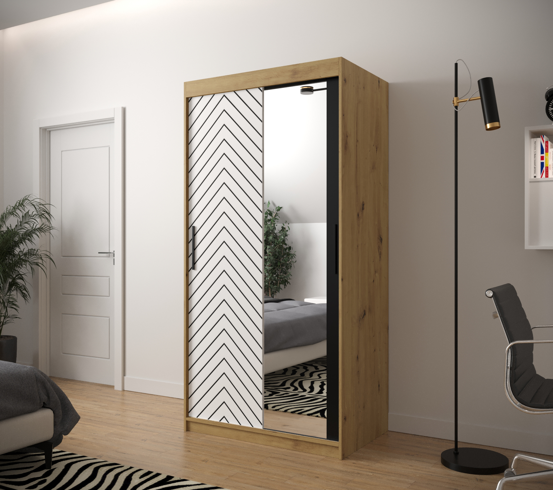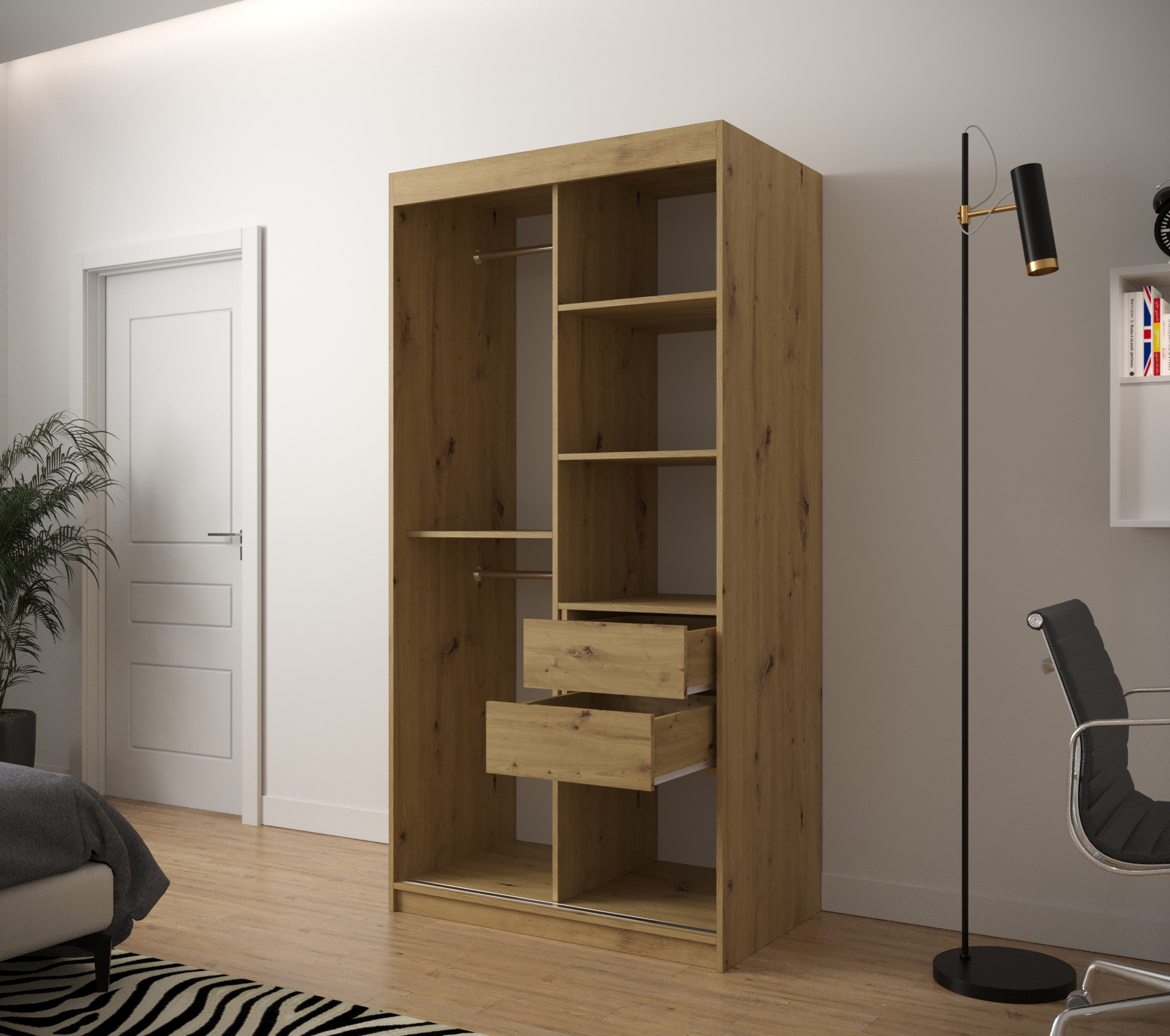 - Vnitřní uspořádání: Skříň je navržena se dvěma šatními tyčemi a policemi, s možností dokoupit zásuvky pro další úložný prostor.