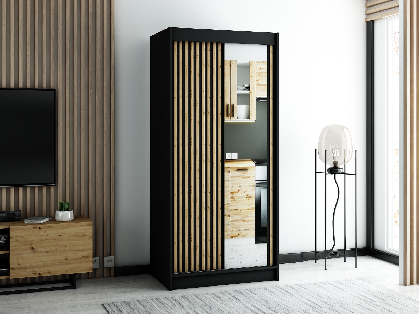 - Zrcadlo: Skříň je vybavena zrcadlem, které opticky zvětšuje prostor a přidává na funkčnosti.