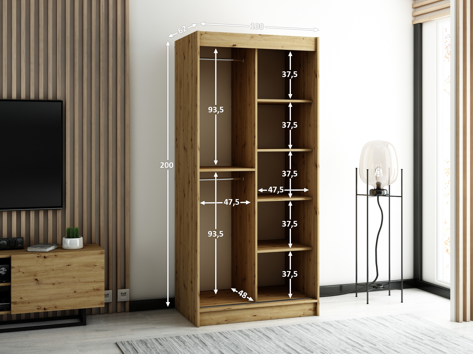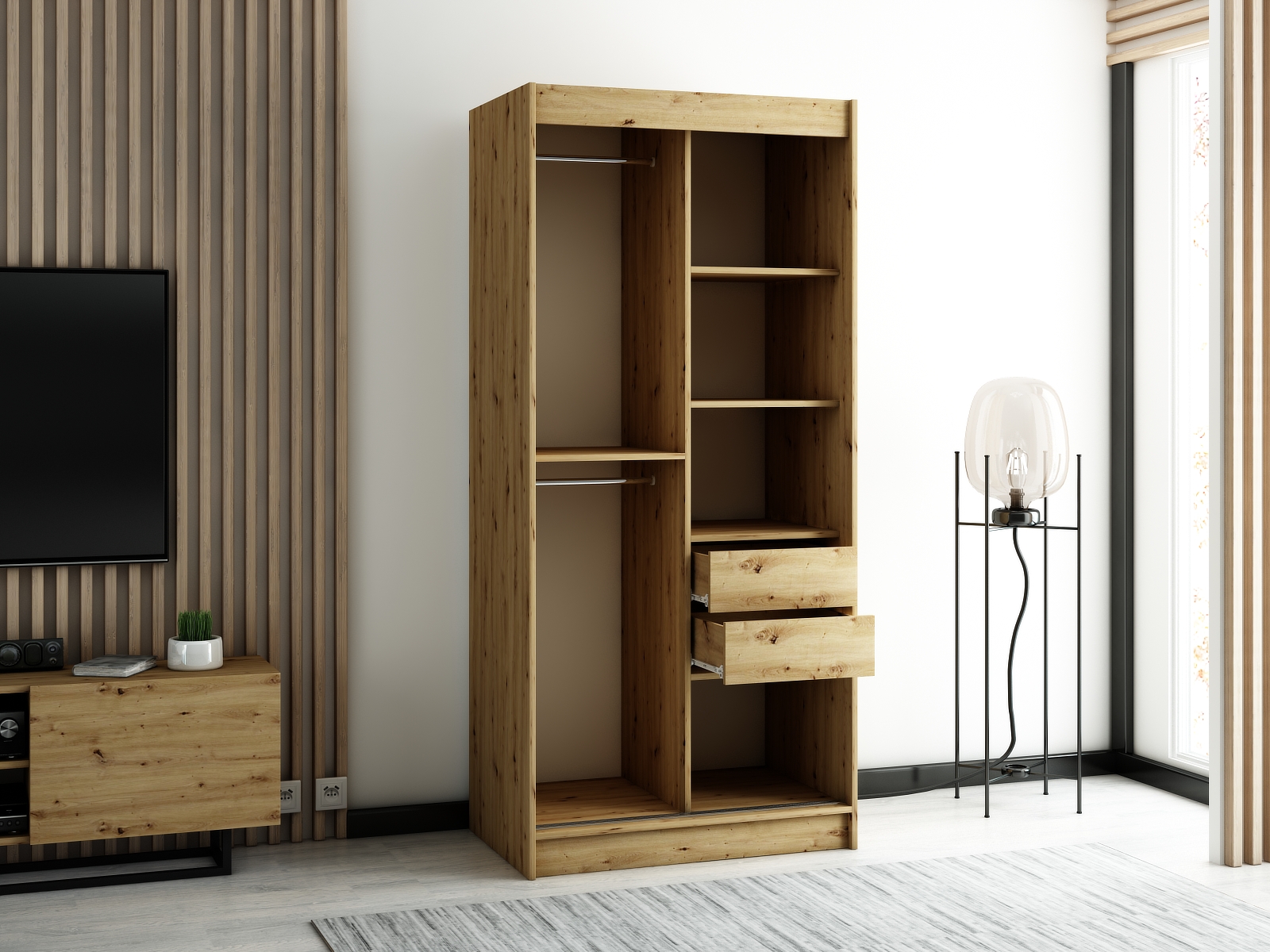 Šatní skříň je navržena s ohledem na maximální využití prostoru. Obsahuje dvě šatní tyče a police, které lze doplnit o zásuvky pro ještě větší úložný prostor. Zásuvky jsou dostupné v barvě korpusu skříně a jsou ideální pro organizaci drobností.