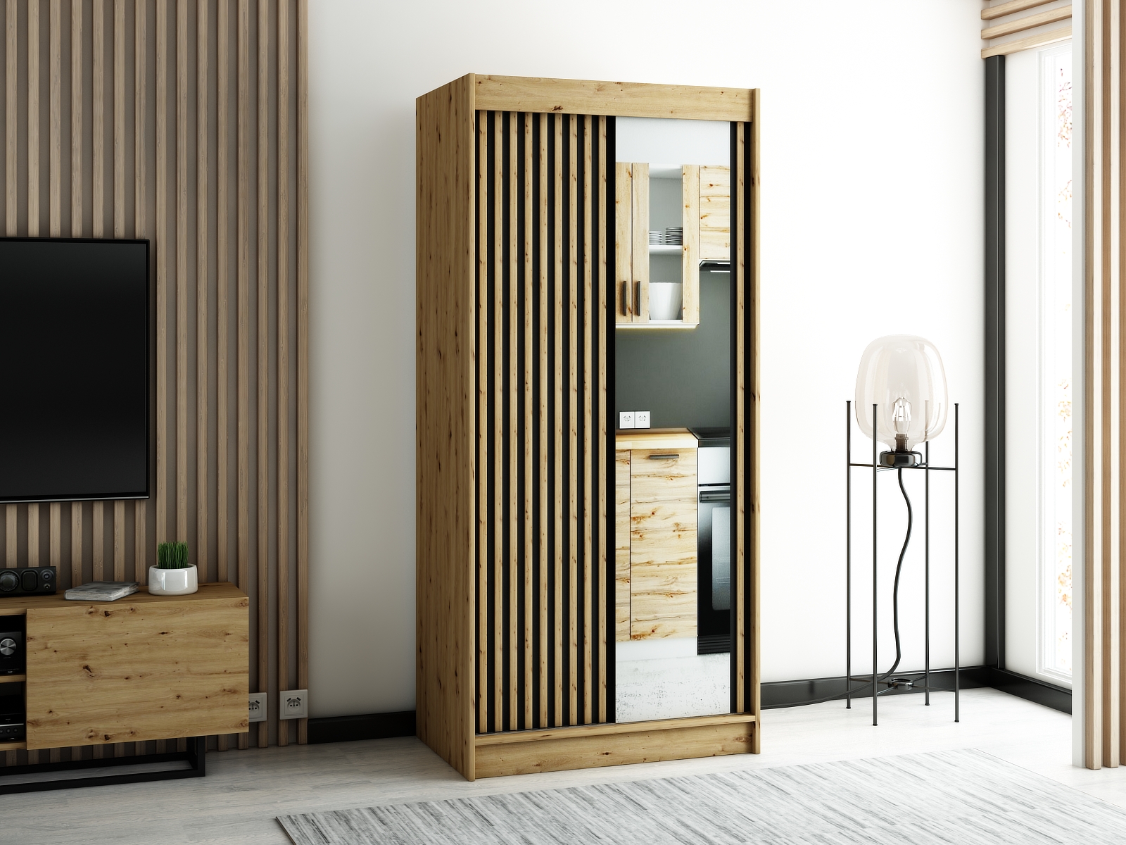 - Ozdobné lamely: Posuvné dveře jsou zdobeny lamelami o síle 2 mm, které dodávají skříni jedinečný vzhled.