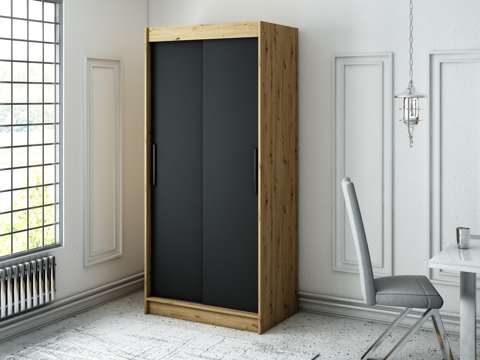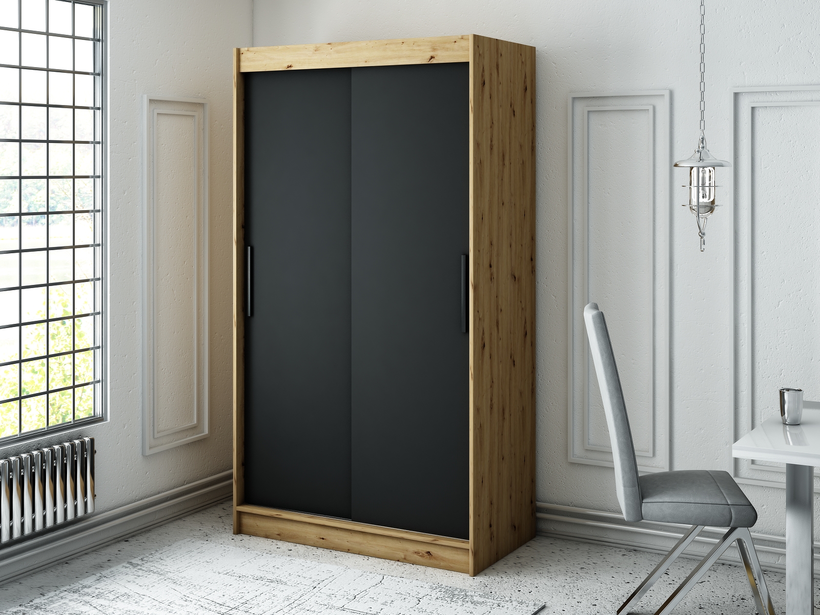 Šatní skříň Abi Leto T je dostupná v atraktivní barevné kombinaci Dub artisan a černý mat, což umožňuje snadné sladění s různými interiérovými styly.