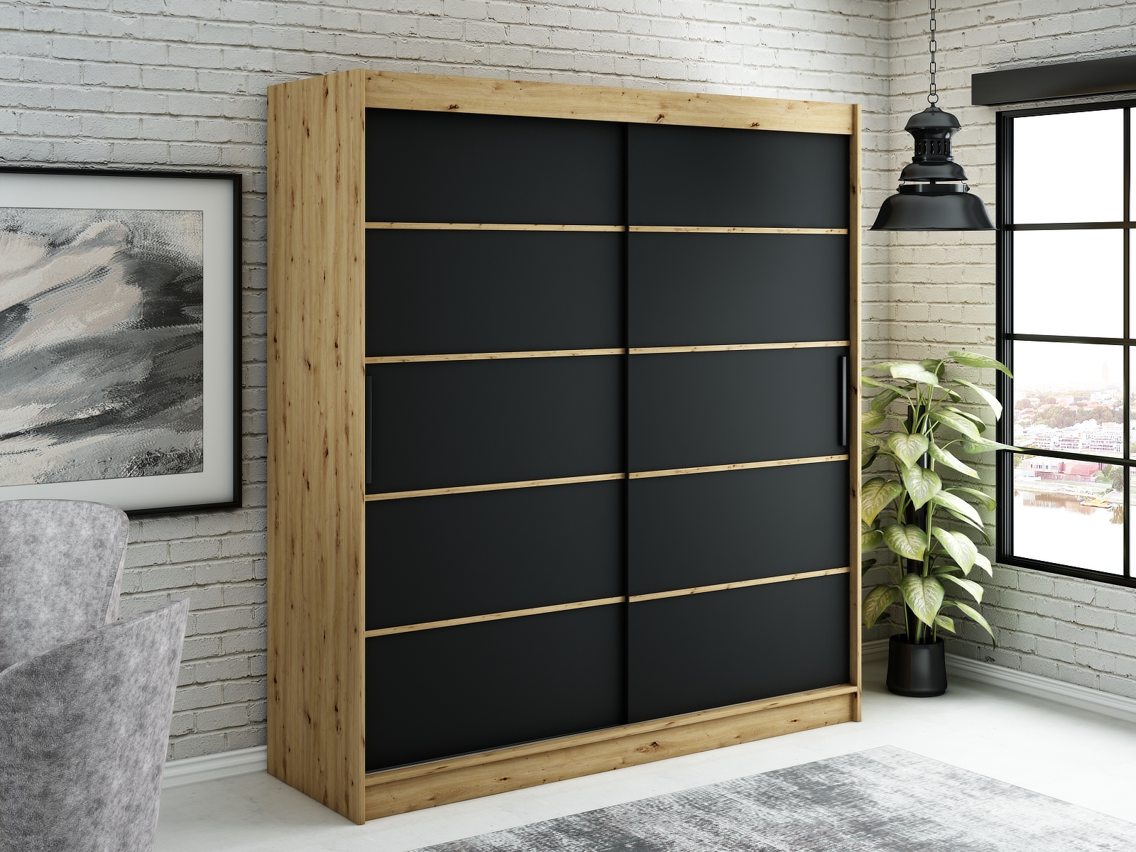 Šatní skříň Abi Leto V1 je k dispozici v barevné kombinaci dub artisan a černý mat, což jí umožňuje snadno zapadnout do jakéhokoli interiéru.