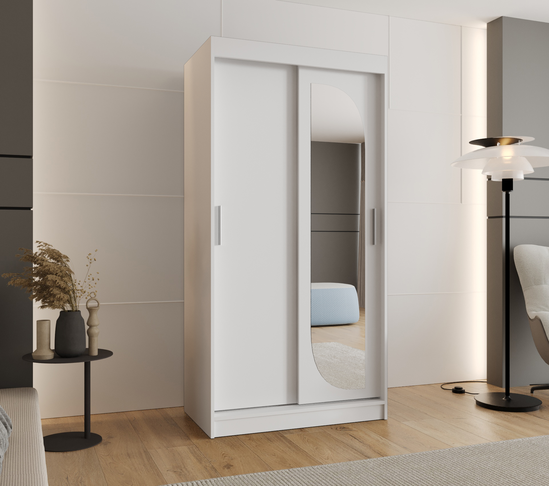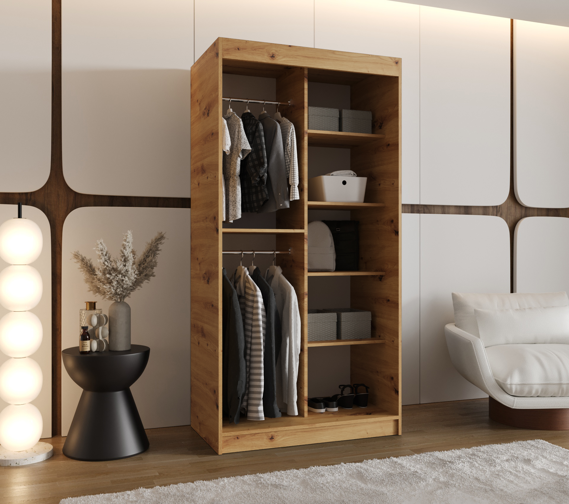 - Vnitřní uspořádání: Skříň je vybavena dvěma šatními tyčemi a policemi, se možností dokoupit zásuvky pro větší úložný prostor.