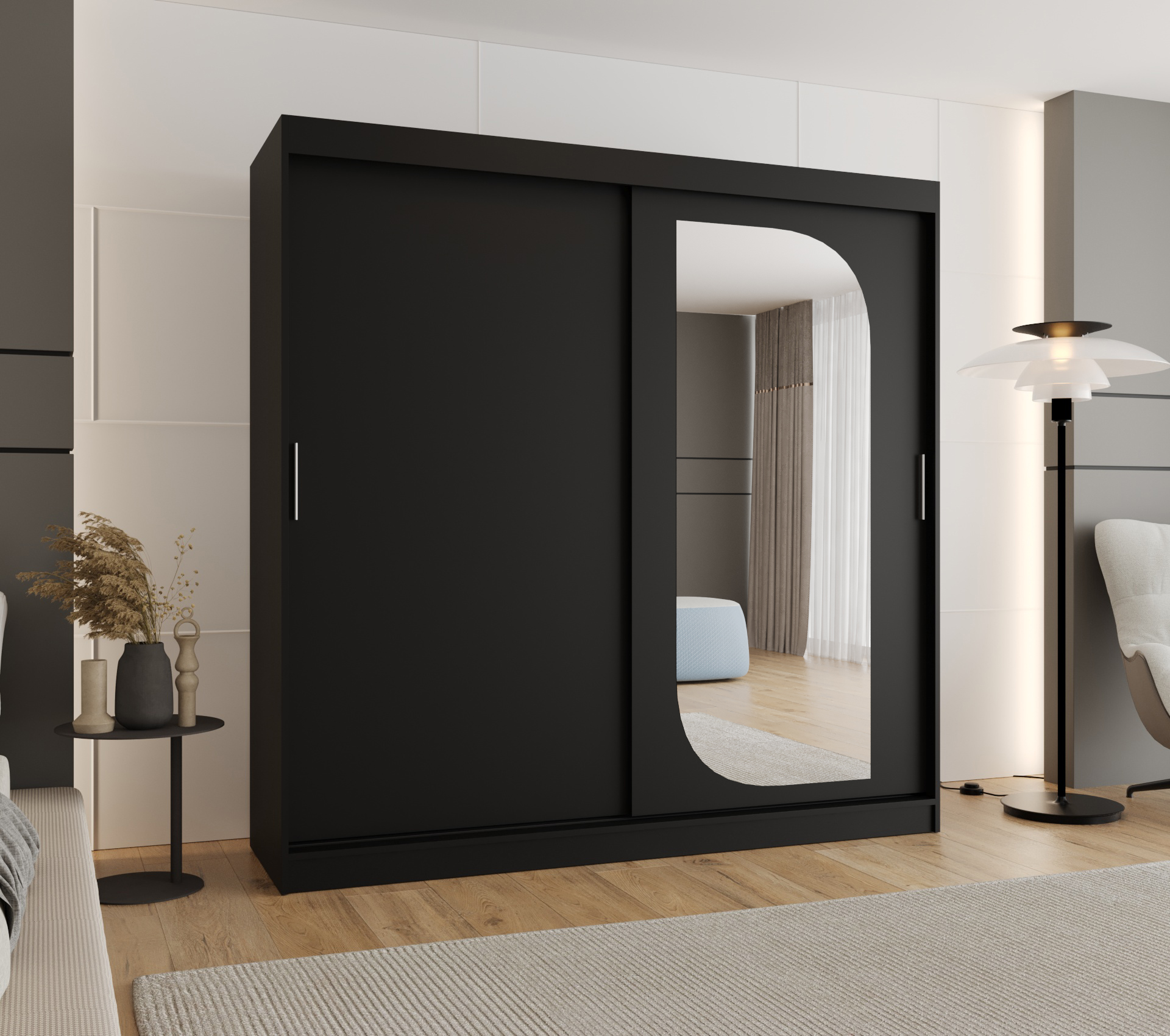 - Zrcadlo: Na dveřích skříně se nachází leštěné zrcadlo, které opticky zvětšuje prostor a usnadňuje každodenní oblékání.