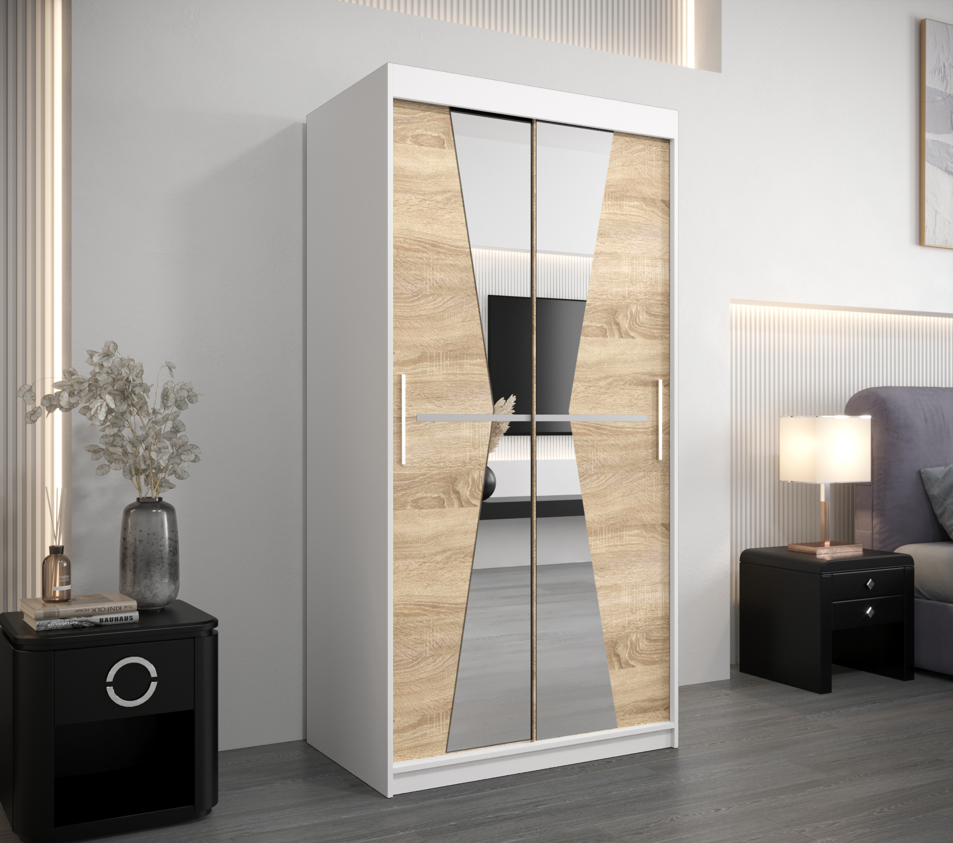 - Zrcadlo: Součástí skříně je zrcadlo, které opticky zvětšuje prostor.