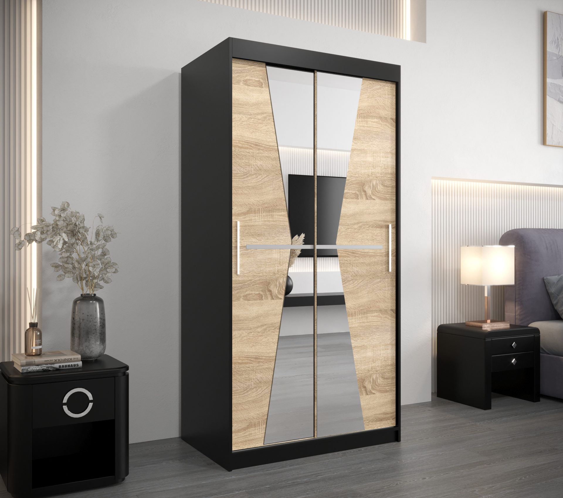 Hledáte stylovou a praktickou šatní skříň do vašeho domova? Šatní skříň Abi Ma v černé barvě korpusu a s posuvnými dveřmi v dekoru dub sonoma je ideální volbou pro každého, kdo ocení moderní design a funkčnost. S rozměry 100 cm je skříň dostatečně prostorná, aby splnila vaše požadavky na úložný prostor.