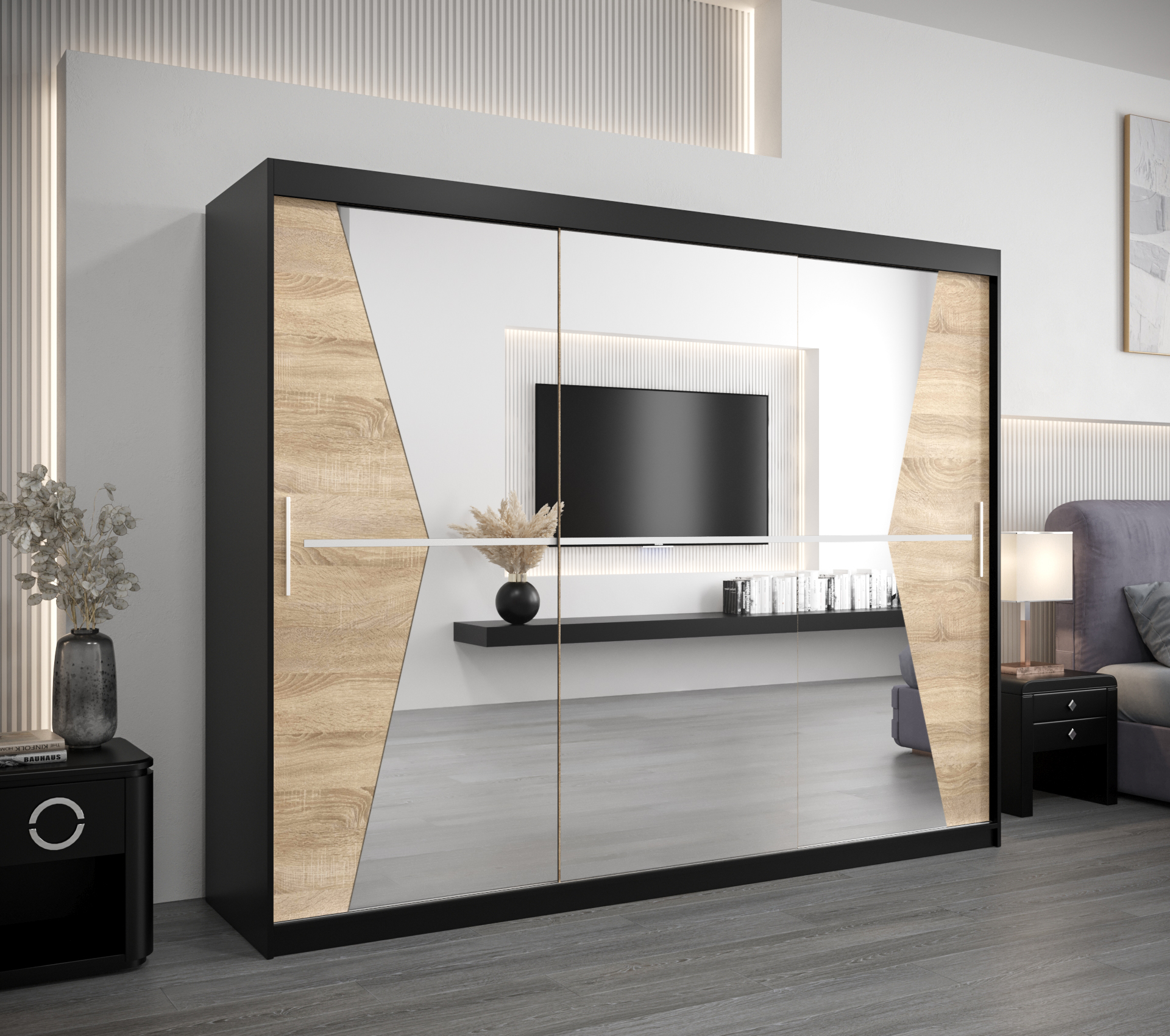Šatní skříň Abi Ma je ideální volbou pro ty, kteří hledají moderní a praktické řešení pro úložný prostor. Tento model o rozměrech 250 cm se pyšní elegantním černým korpusem a dveřmi v dekoru dub sonoma, což dodává vašemu interiéru jedinečný vzhled.