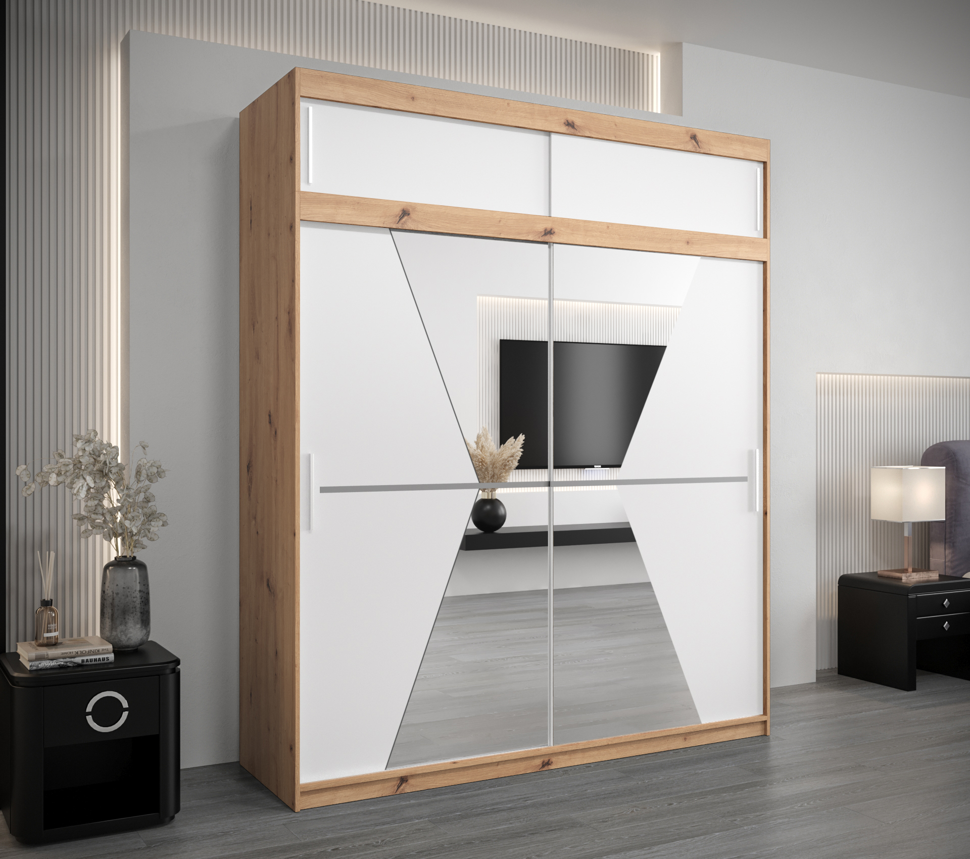 - Zrcadlo: Součástí skříně je zrcadlo, které opticky zvětšuje prostor.