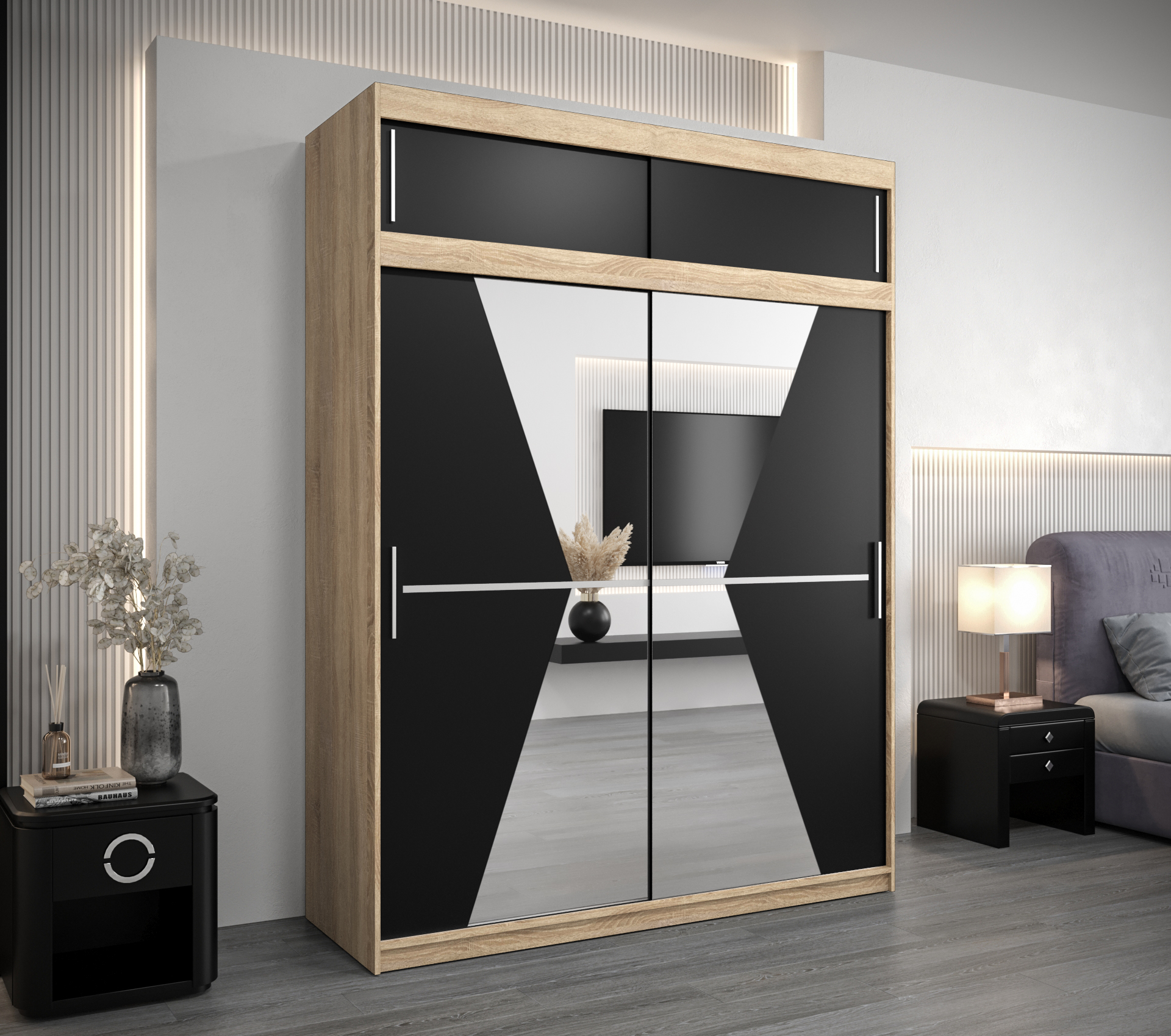 Šatní skříň Abi Ma s nástavcem je moderní a stylový kus nábytku, který se stane středobodem vaší ložnice. S korpusem v dekoru dub sonoma a elegantními černými posuvnými dveřmi, tato skříň nejenže skvěle vypadá, ale také nabízí praktické řešení pro uskladnění vašich věcí.
