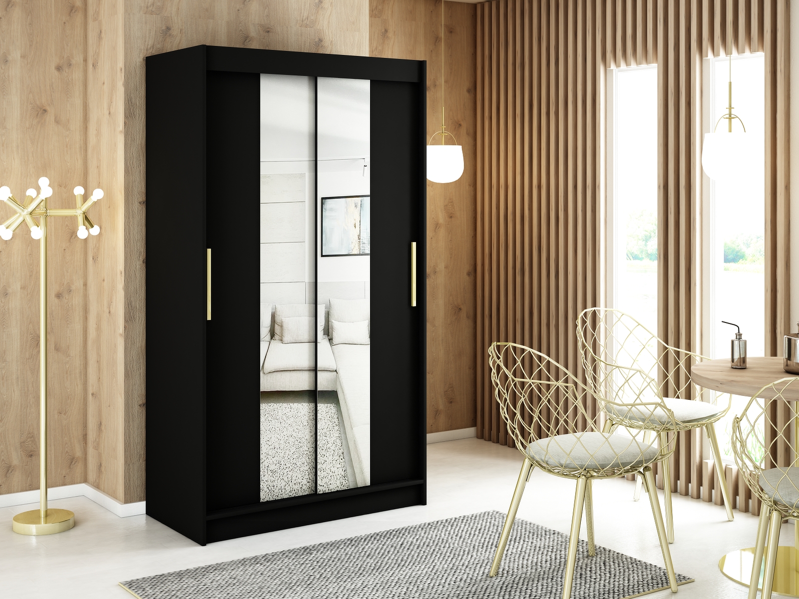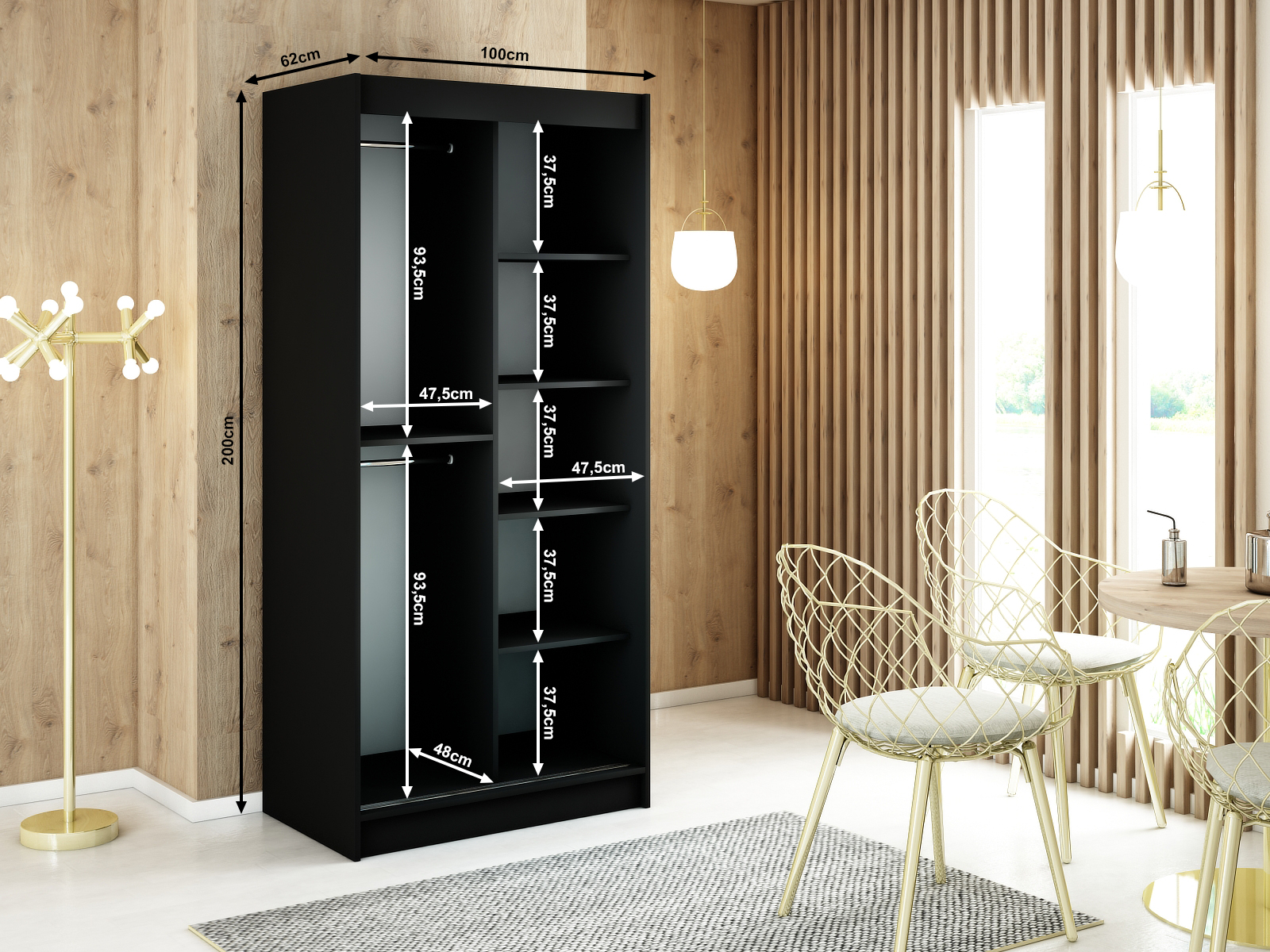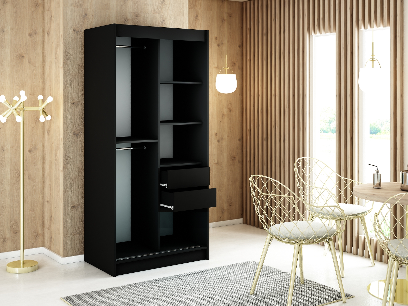 - Vnitřní uspořádání: Skříň nabízí dvě šatní tyče a police, s možností dokoupení zásuvek pro ještě větší úložný prostor.