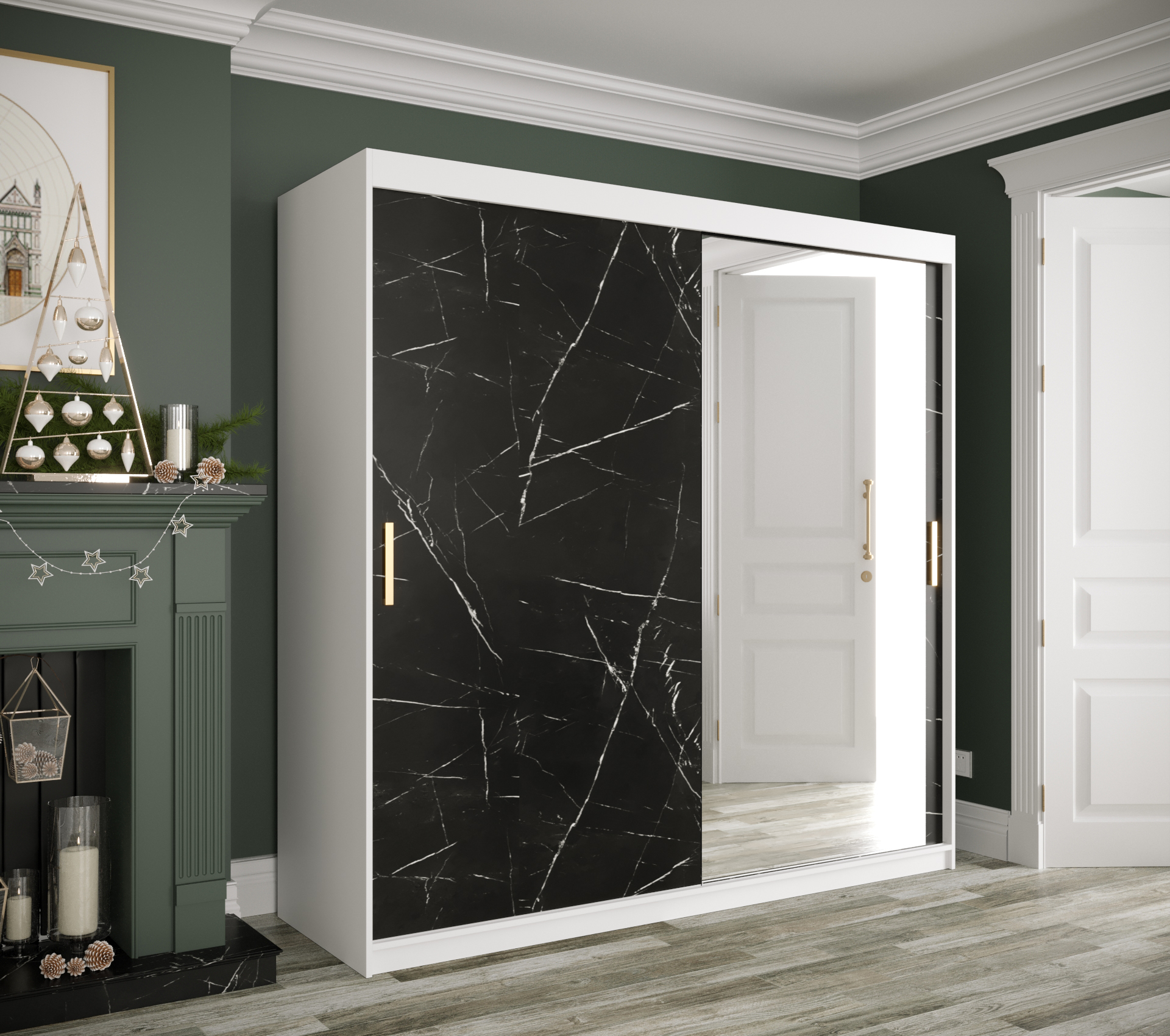 - Zrcadlo: Skříň je vybavena zrcadlem, které opticky zvětšuje prostor a je praktickým pomocníkem při oblékání.