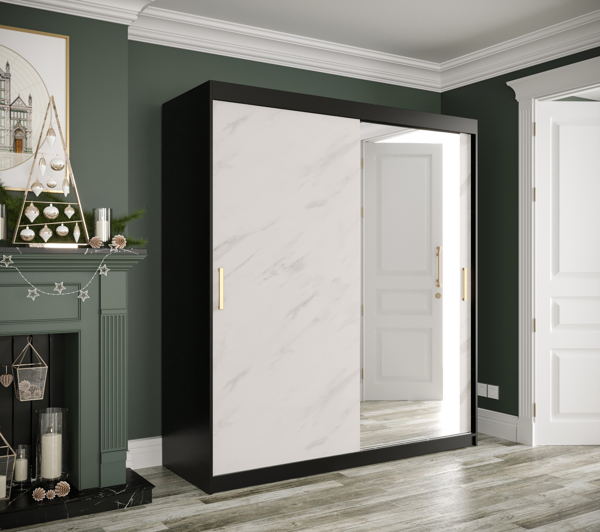 - Stylové detaily: Plastové zlaté úchyty dodávají skříni elegantní vzhled, zatímco zrcadlo na dveřích opticky zvětšuje prostor.