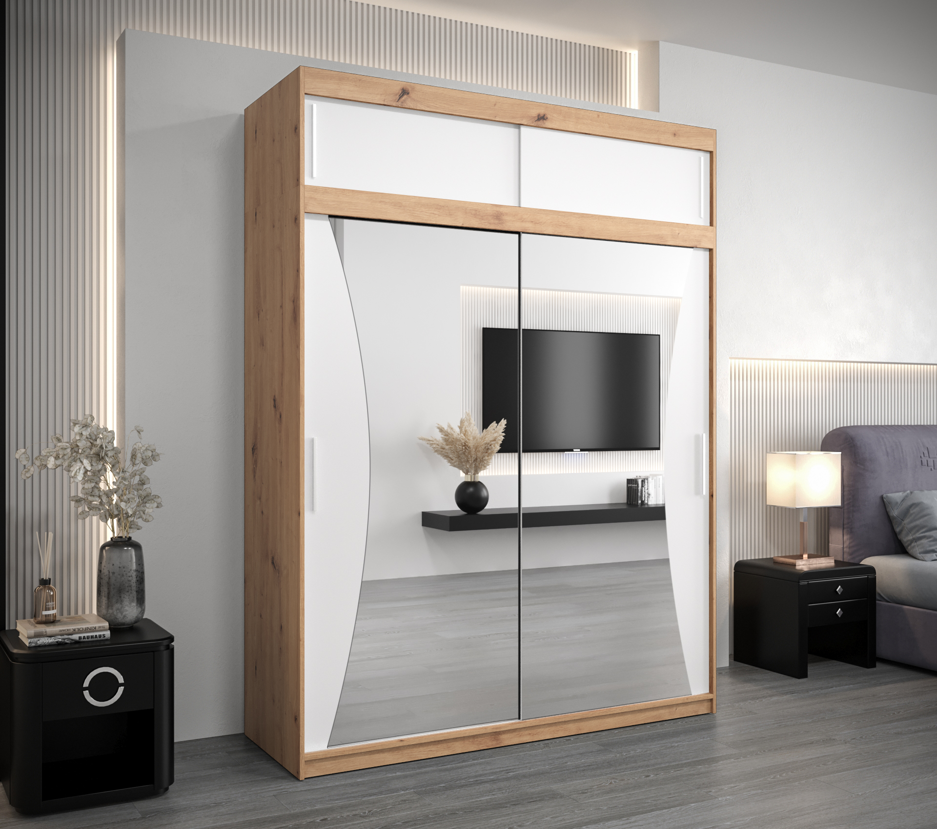 - Zrcadlo: Součástí skříně je zrcadlo, které opticky zvětšuje prostor a přidává na funkčnosti.
