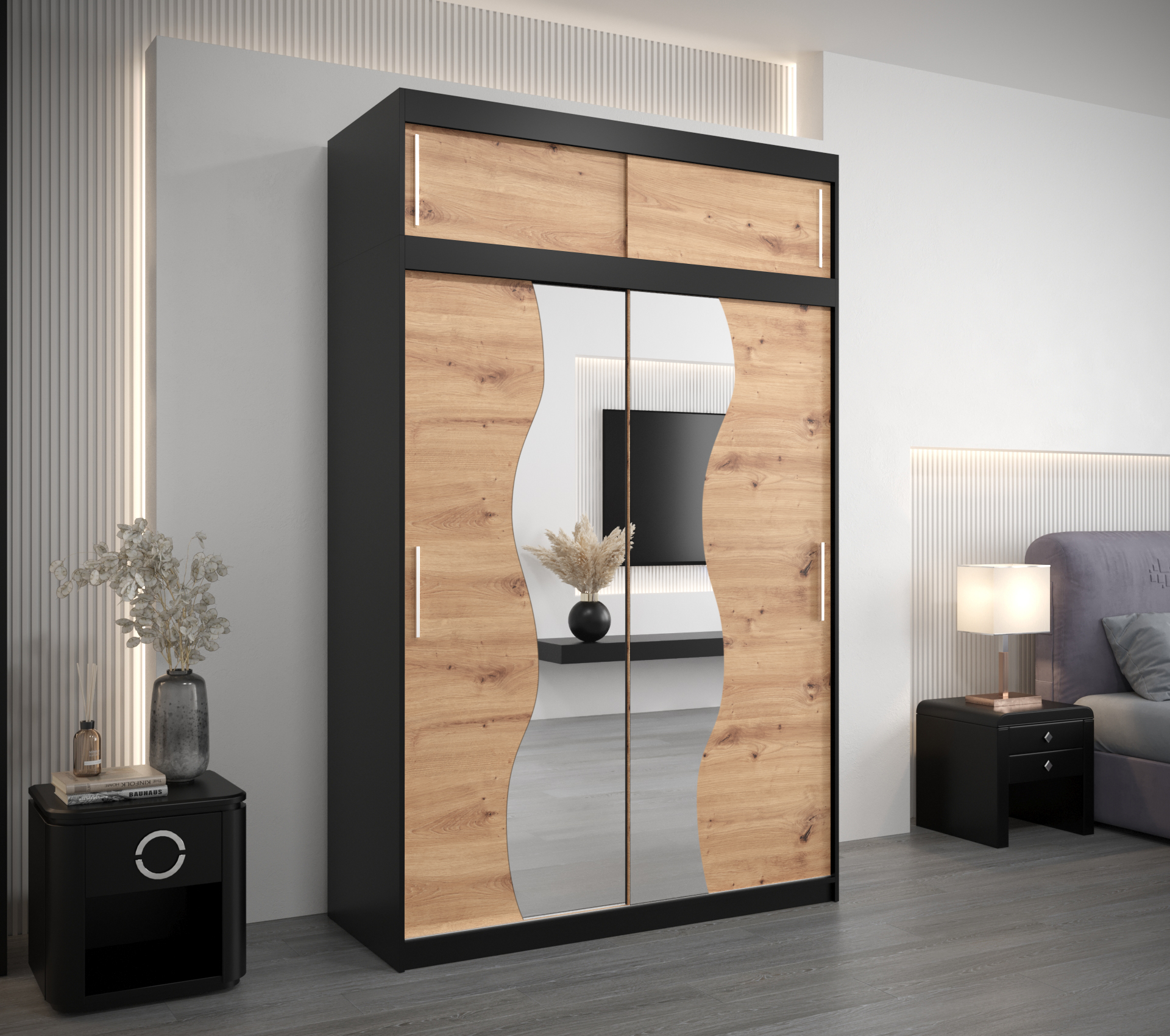 - Vnitřní uspořádání: Skříň obsahuje dvě šatní tyče a police, s možností dokoupit zásuvky pro ještě větší praktičnost.
