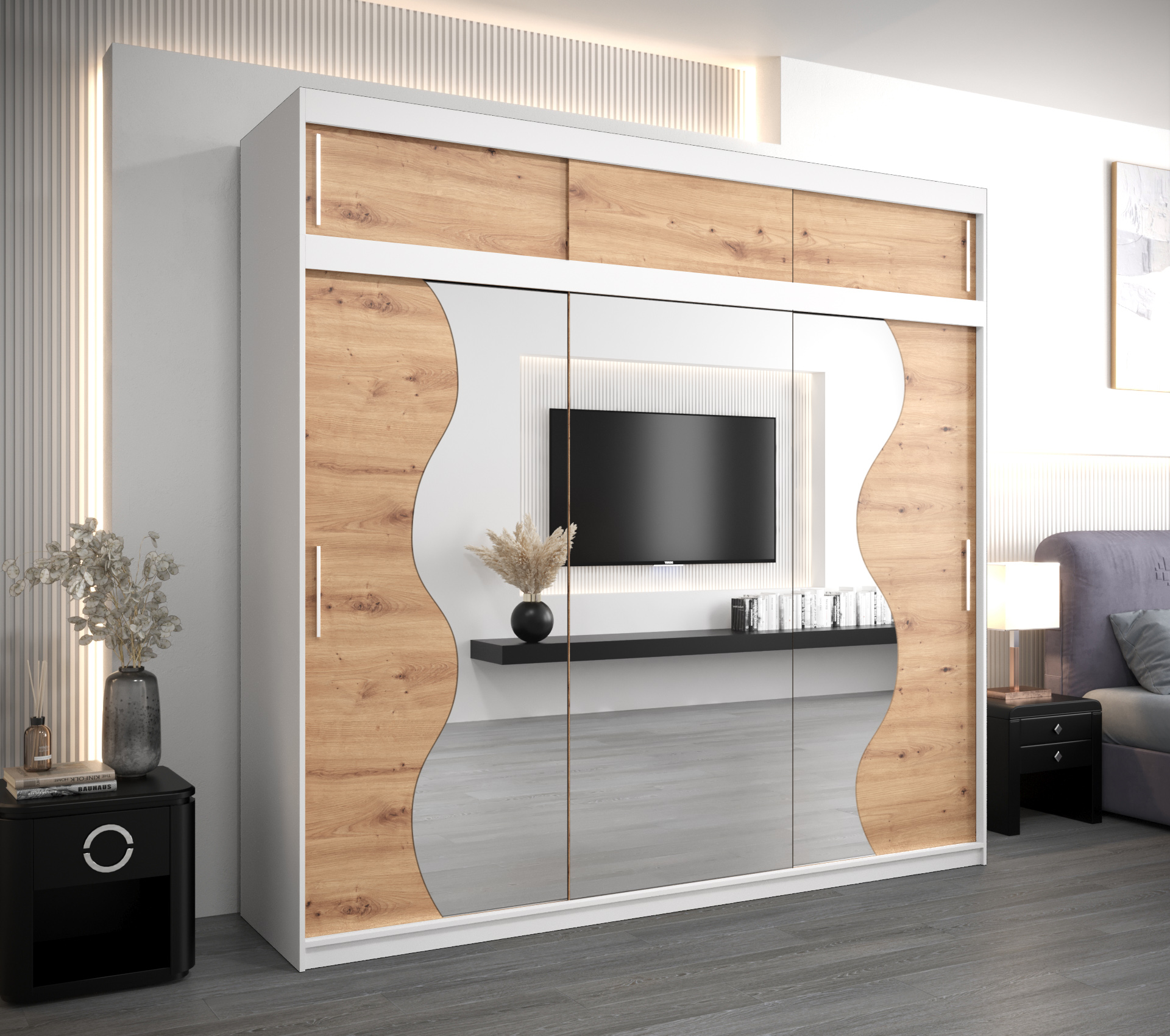 Skříň má celkovou výšku 240 cm a šířku 250 cm, což z ní činí ideální volbu pro prostorné ložnice. Je také dostupná v dalších šířkách, takže si můžete vybrat variantu, která nejlépe vyhovuje vašim potřebám.