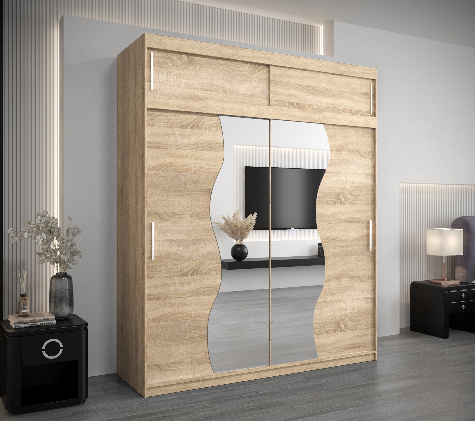 - Zrcadlo: Skříň je vybavena zrcadlem, které opticky zvětšuje prostor a přidává na eleganci.